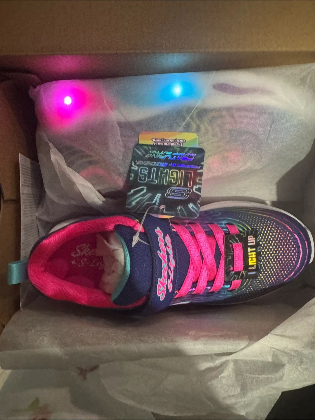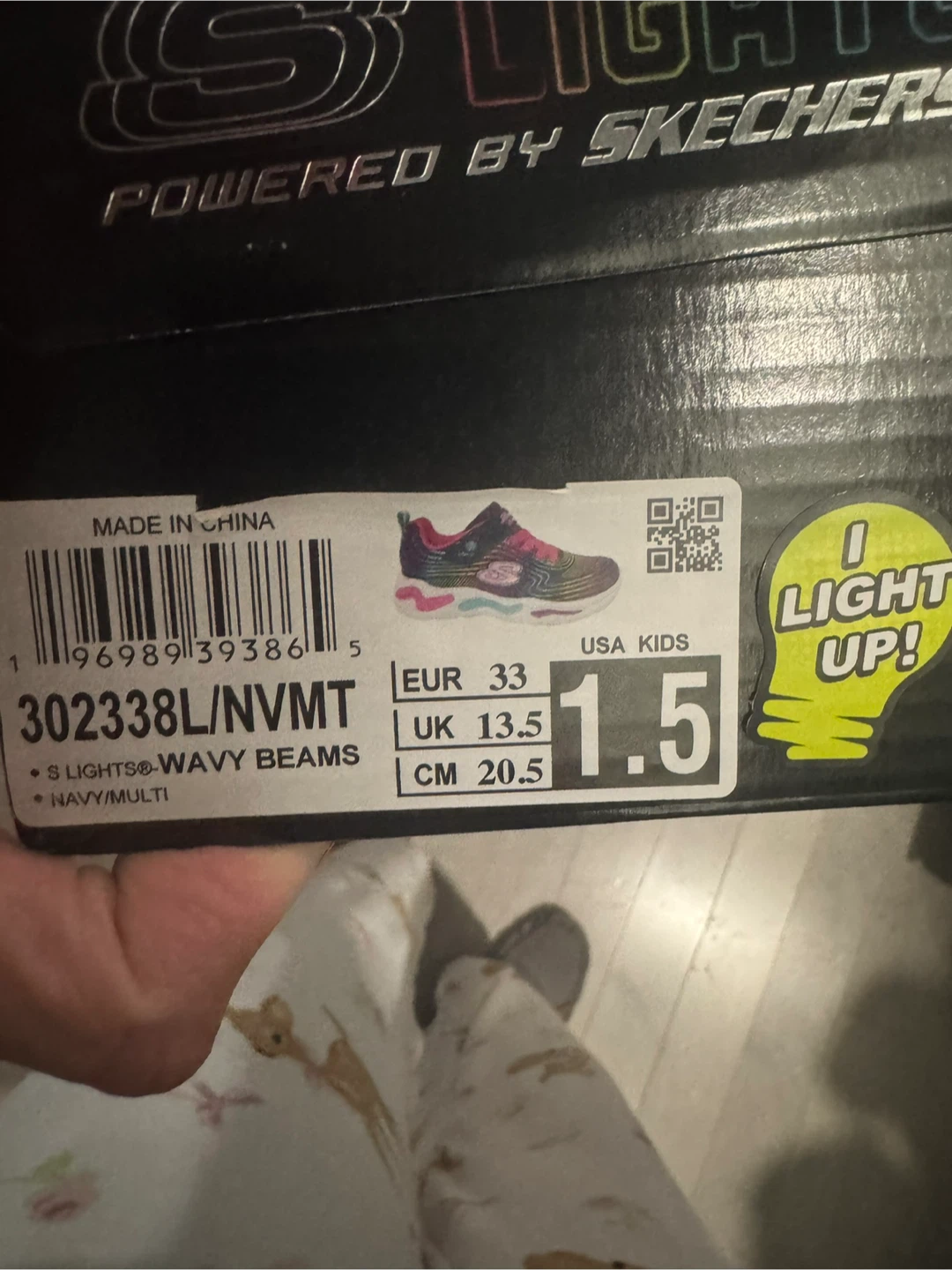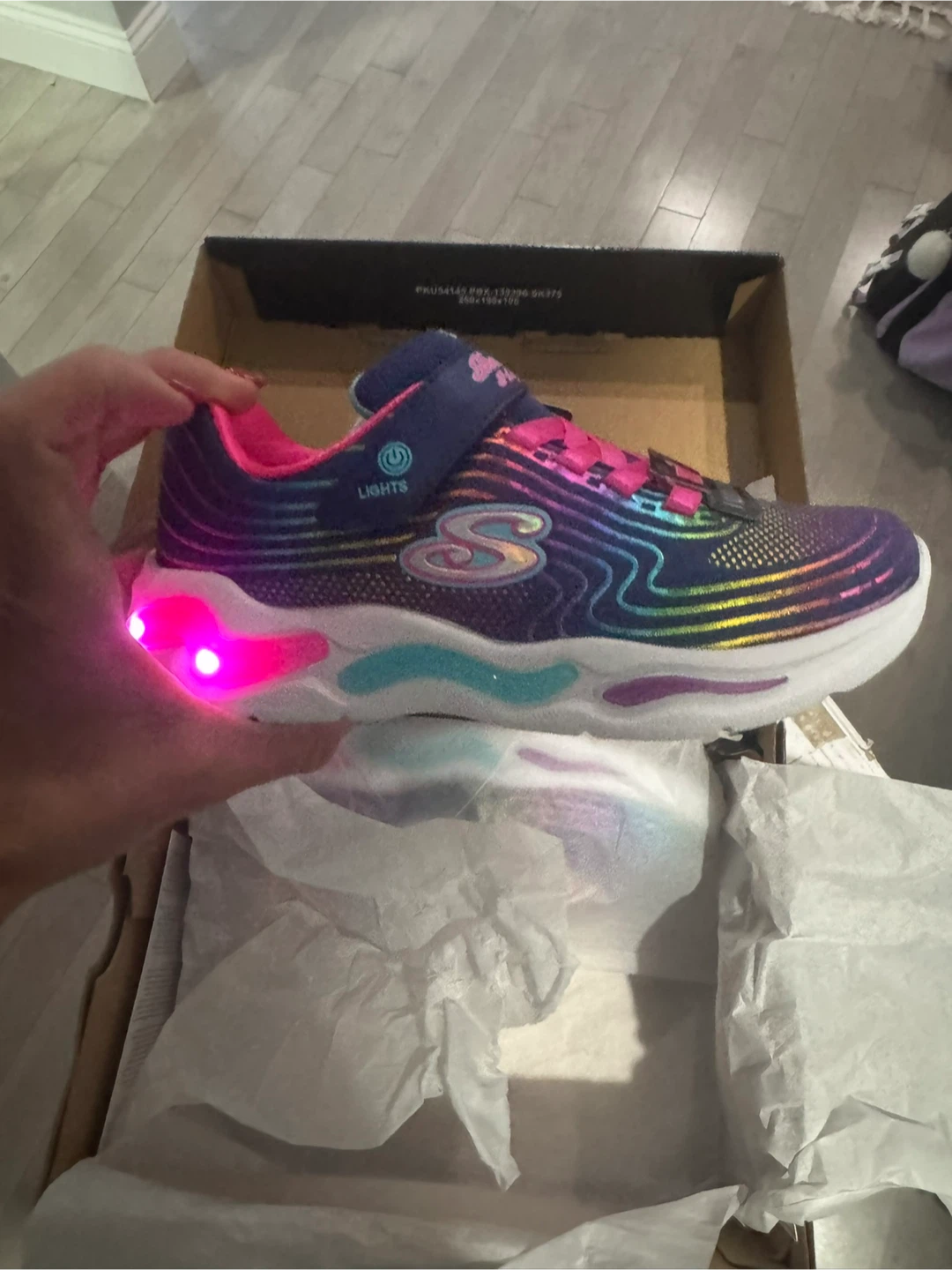 These colorful Skechers "S Lights" shoes feature a wavy, multi-color design. They're designed for kids and light up when worn. Includes original box and packaging. Size 1.5 US kids.