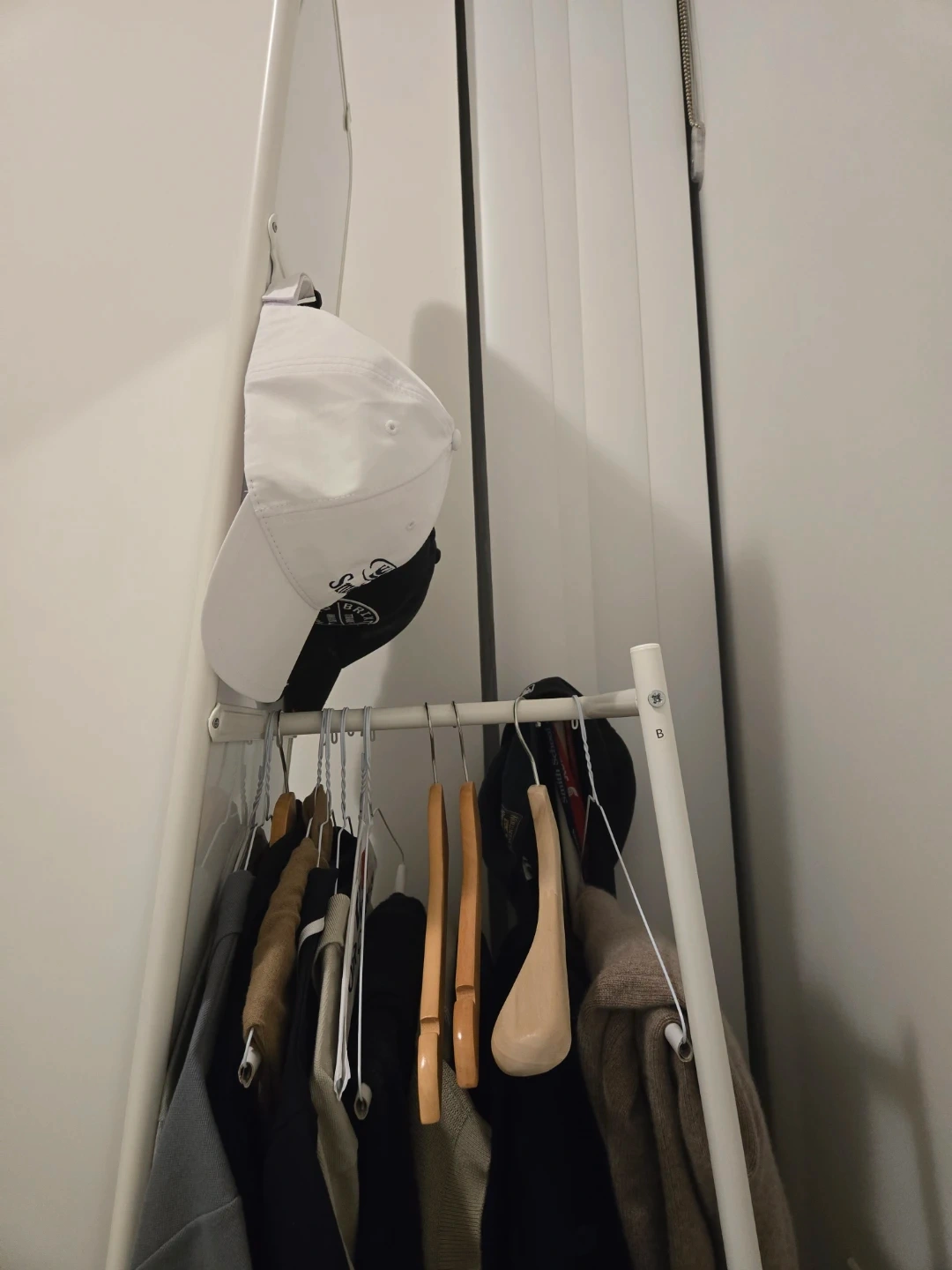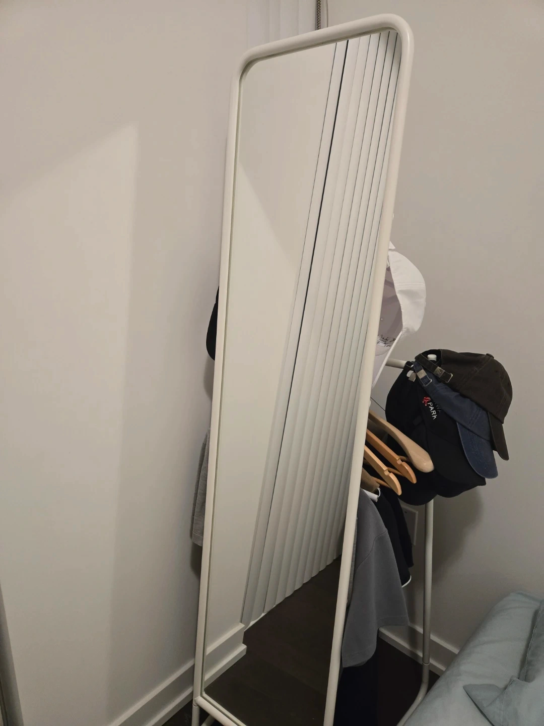 Selling a white standing mirror with a built-in clothing rack. It's a great space-saving solution for smaller rooms or apartments. The mirror is in good condition and the rack is perfect for hanging clothes.