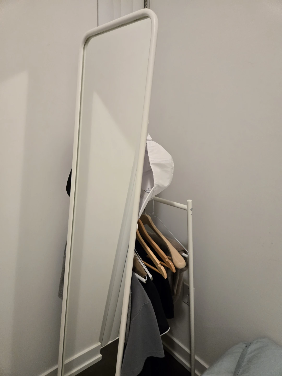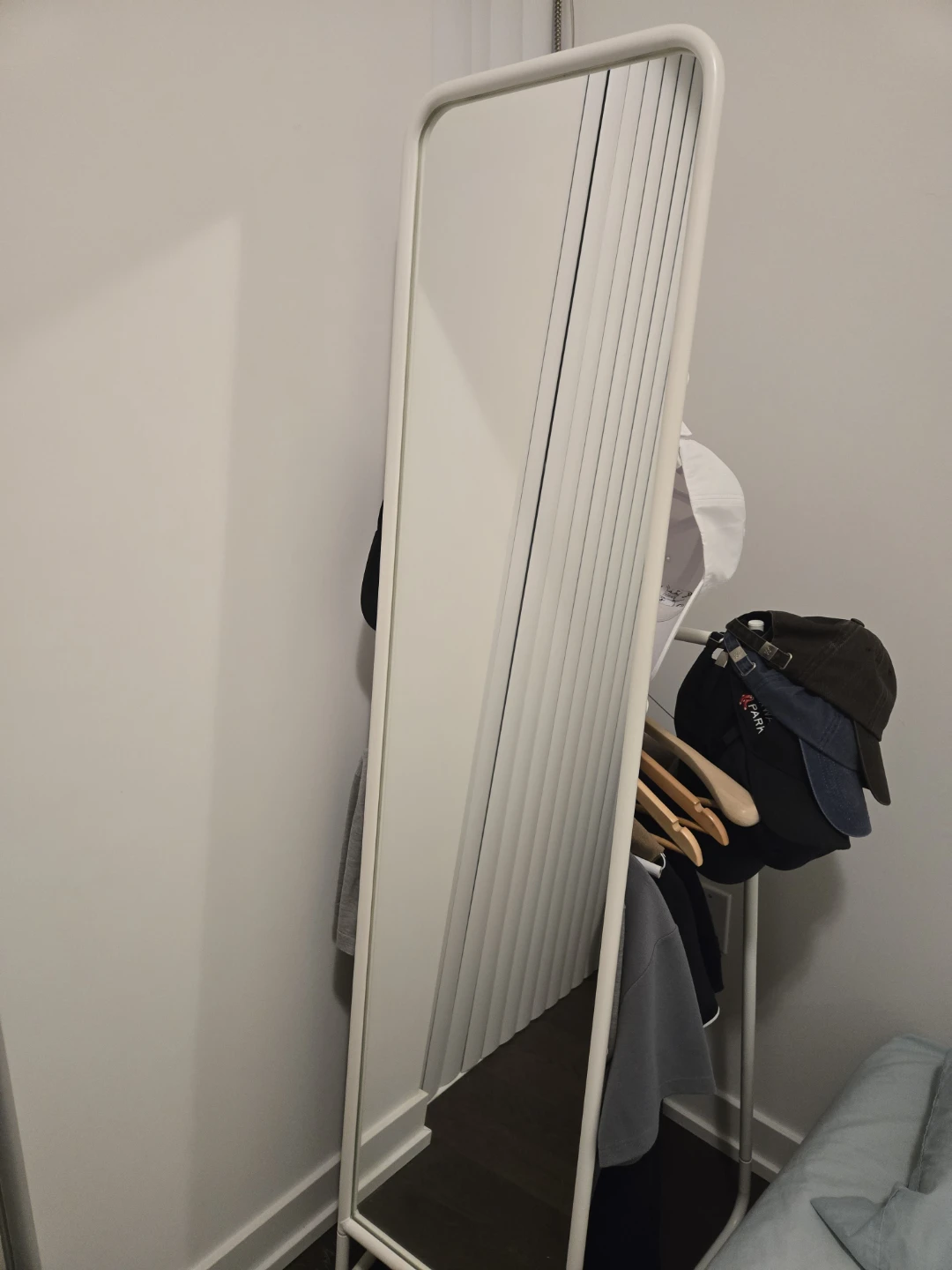 Selling a white standing mirror with a built-in clothing rack. It's a great space-saving solution for smaller rooms or apartments. The mirror is in good condition and the rack is perfect for hanging clothes.
