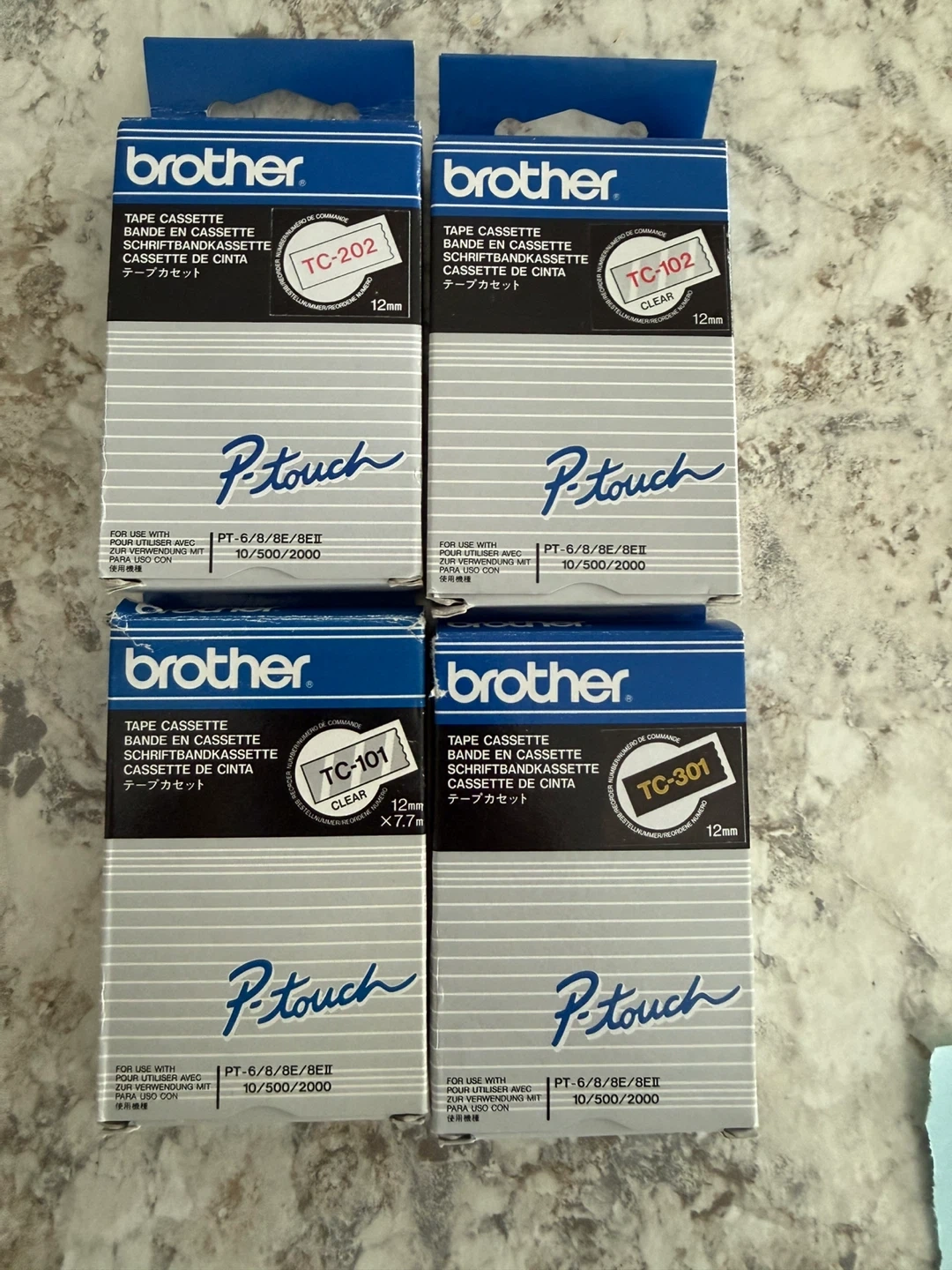 Four Brother P-Touch tape cassettes are available. These are for use with PT-6/8/8E/8EII, 10/500/200 label makers. They come in TC-102, TC-202, TC-101, and TC-301 models.