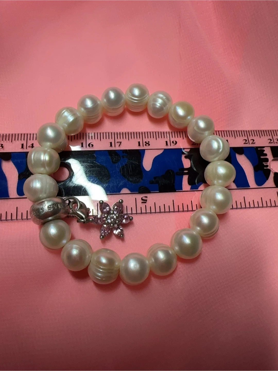 This Thomas Sabo bracelet features a strand of genuine pearls. It's adorned with a silver charm shaped like a flower, inlaid with small pink stones. The bracelet charm includes a lobster clasp closure.