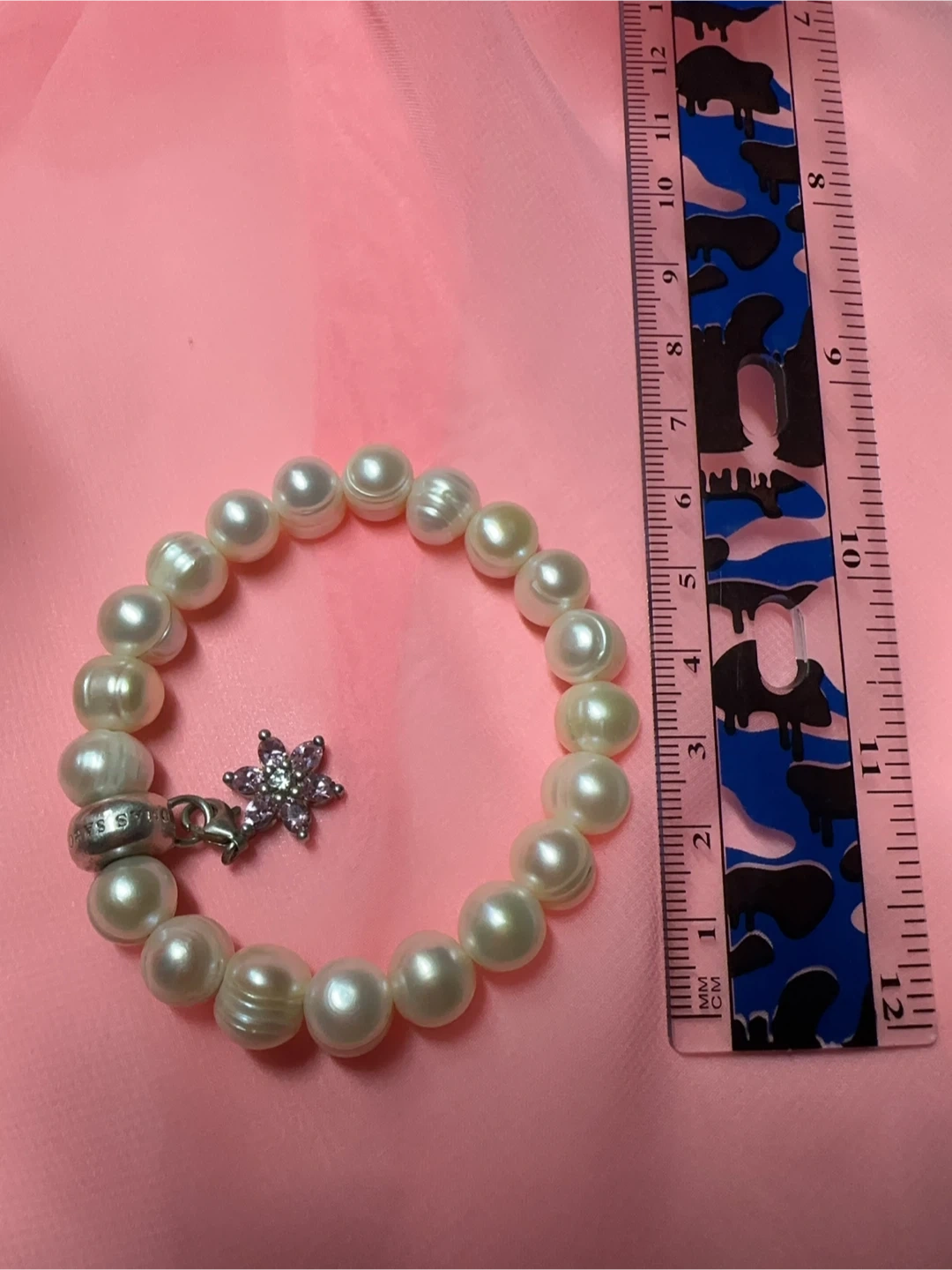 This Thomas Sabo bracelet features a strand of genuine pearls. It's adorned with a silver charm shaped like a flower, inlaid with small pink stones. The bracelet charm includes a lobster clasp closure.
