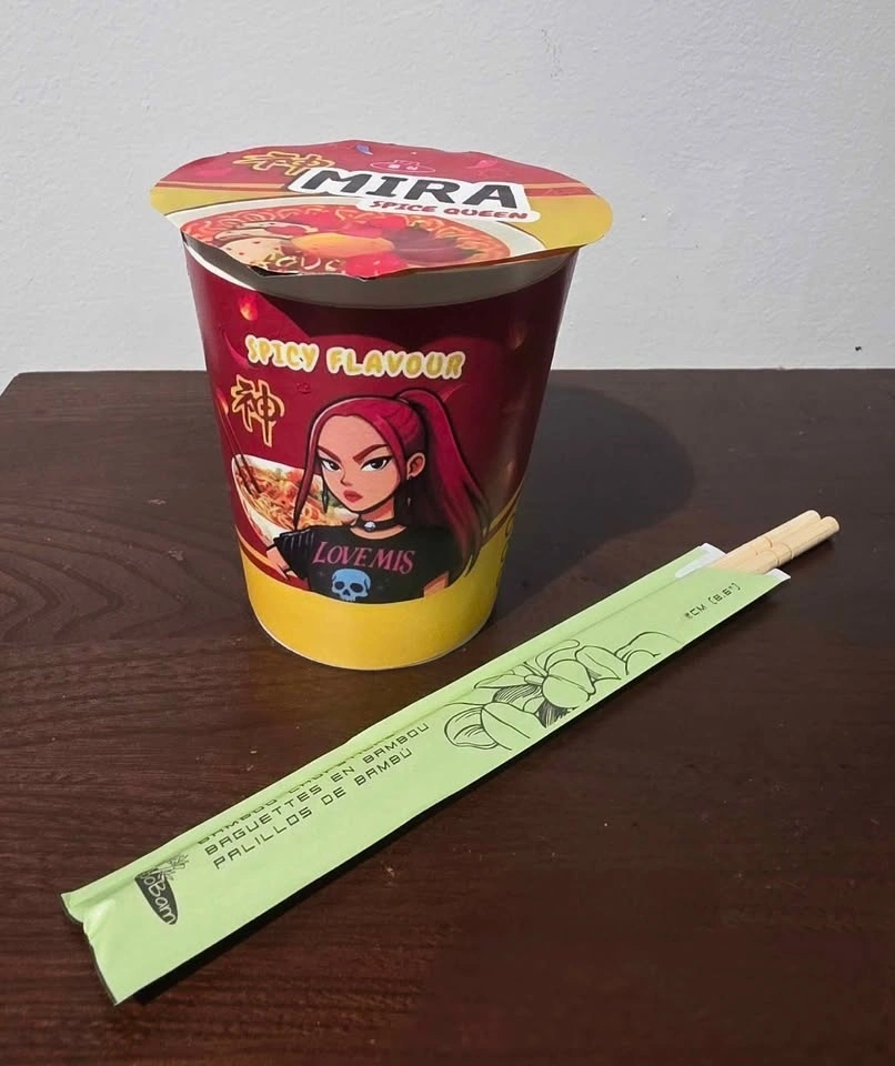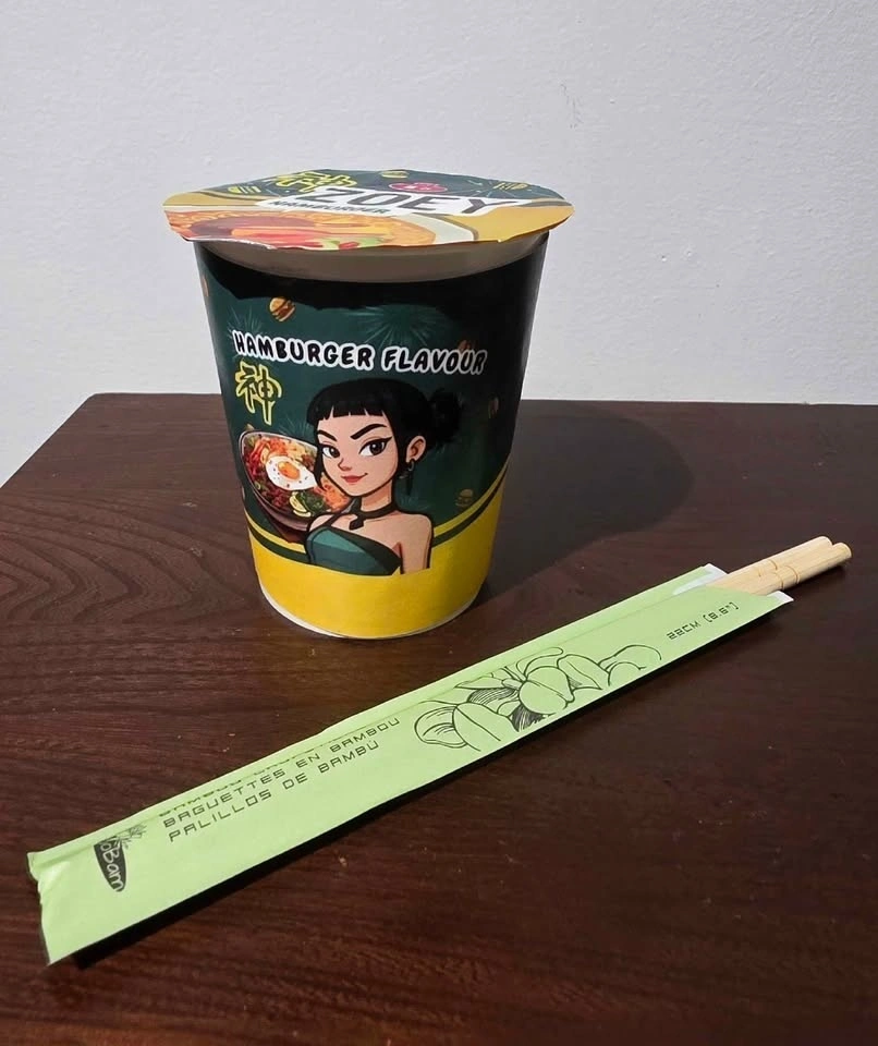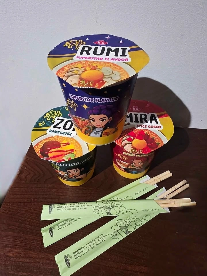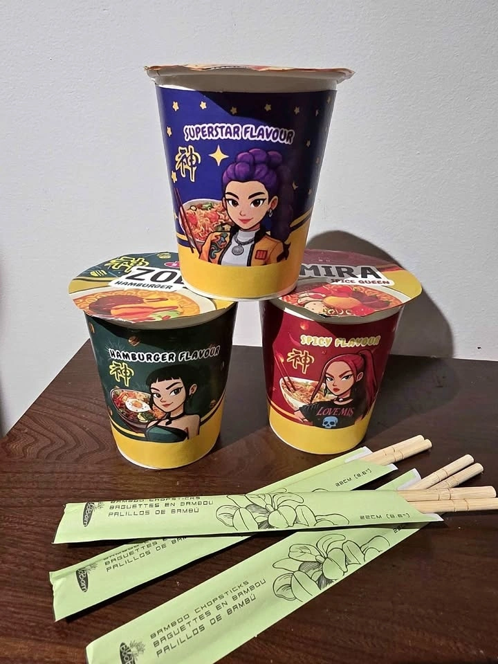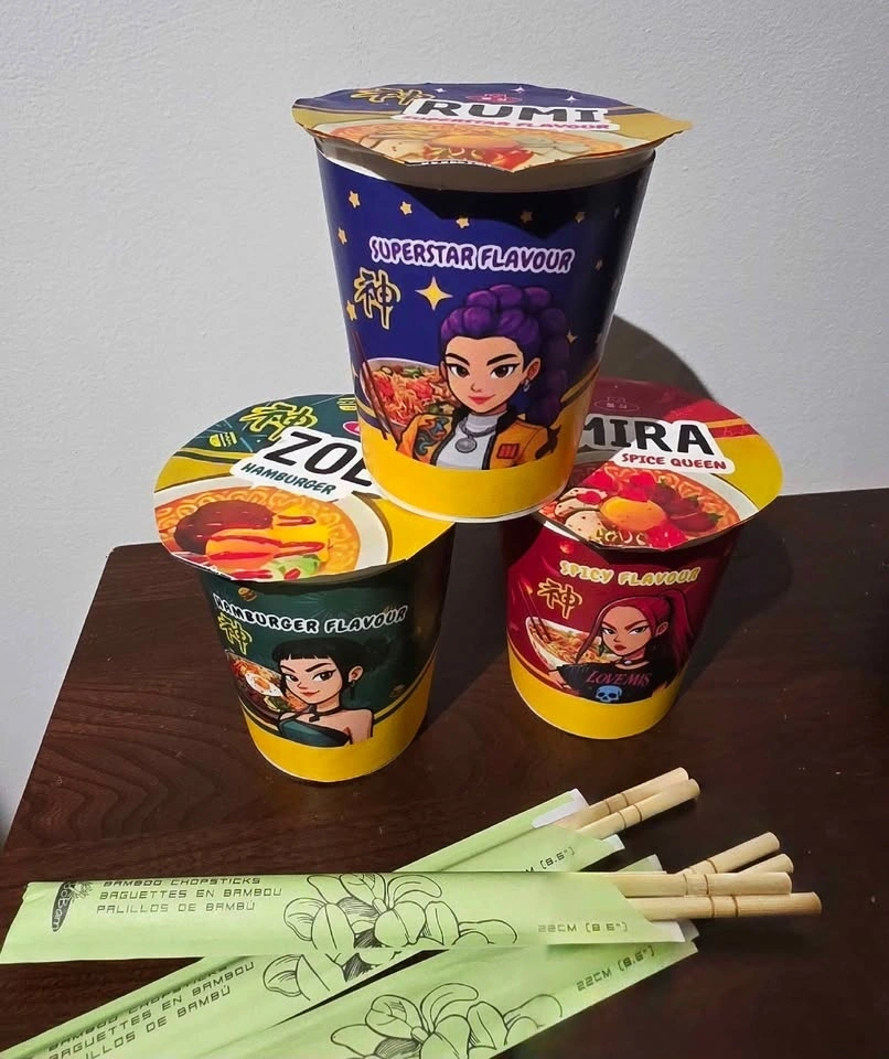 K-pop Demon Hunters ramen cups featuring 3 different designs: Tumi, Zoey, and Mira. Each cup has a flavor option on the side. Great for K-pop lovers, Easter, birthdays, or Christmas. Each soup comes with a pair of chopsticks. $5 each. Ask me about custom orders!