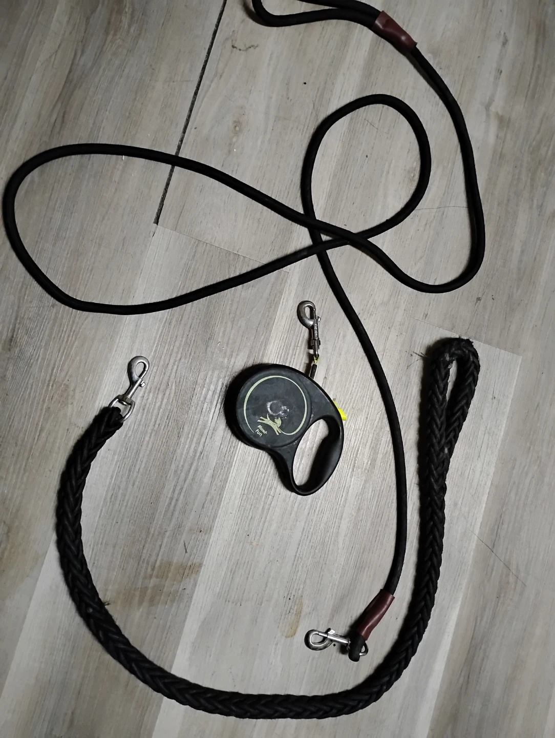 Two black dog leashes included. One is a thick braided rope leash with a metal clasp. The other is a retractable leash with a comfortable handle and a metal clip. Both are in good condition!