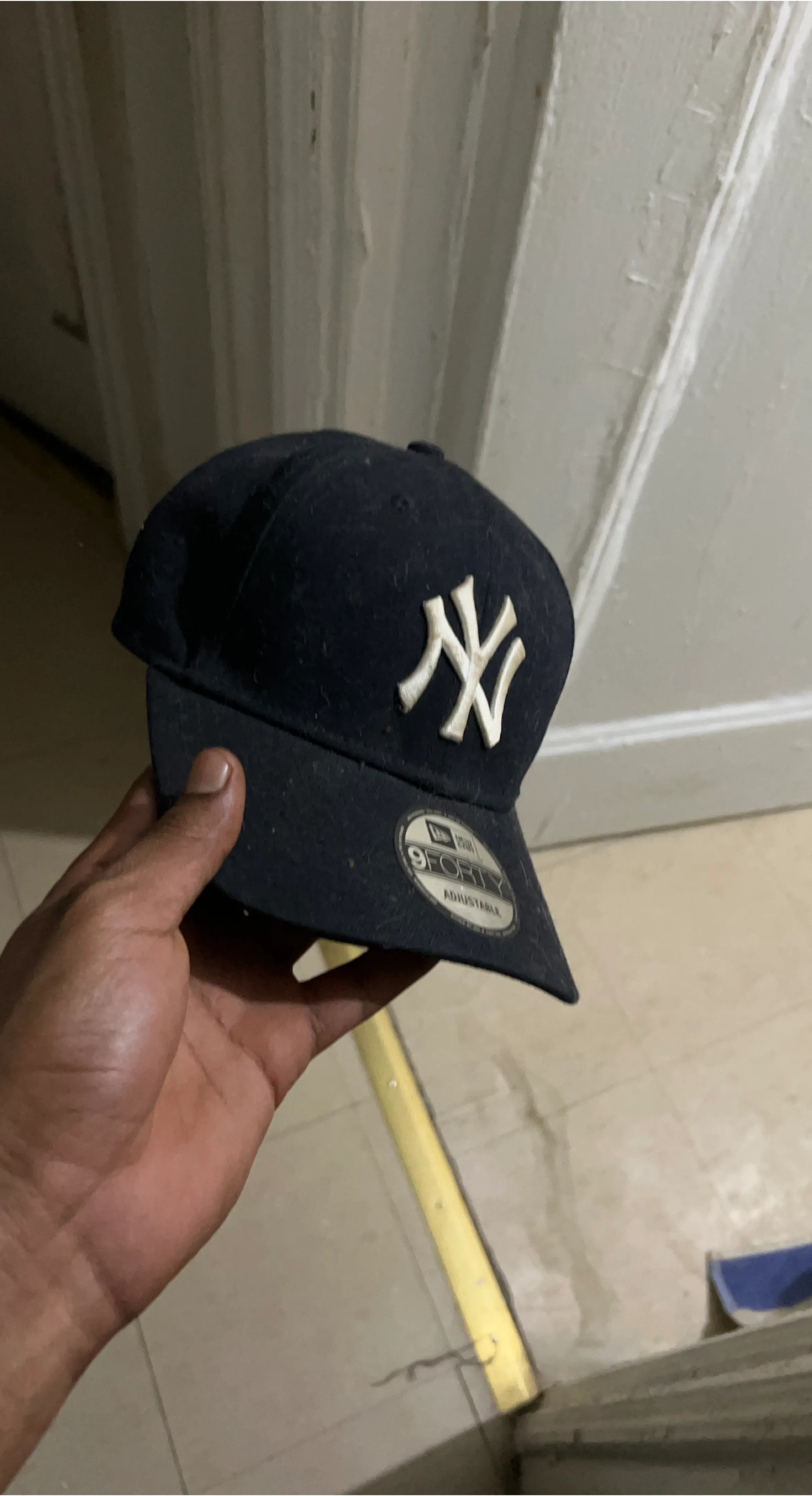 This is a black New Era 9FORTY adjustable baseball cap featuring the New York Yankees logo. It's a one-size-fits-most adjustable hat. Great for any Yankees fan!
