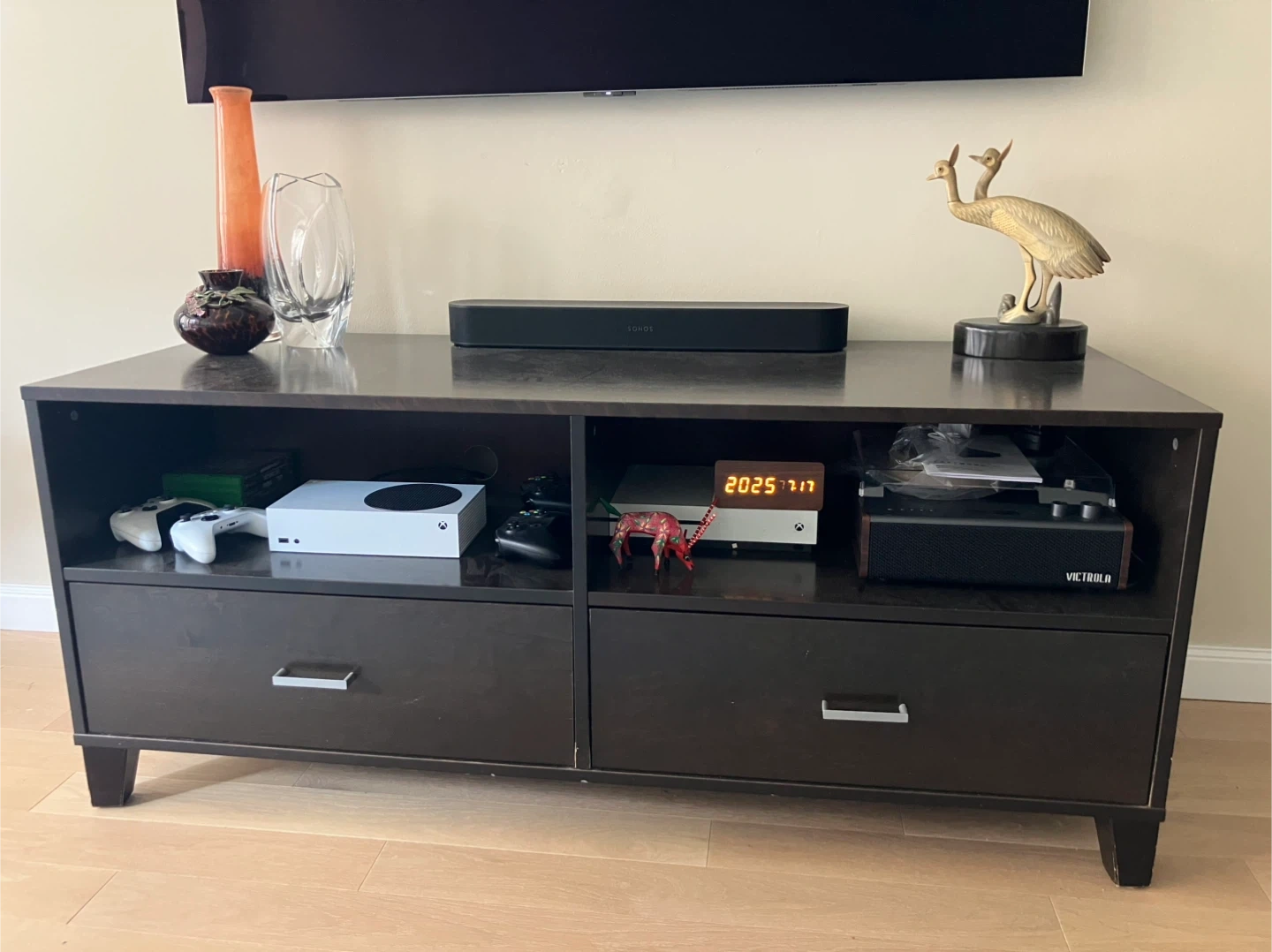 Designer media console, wood in expesso brown