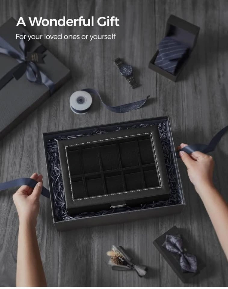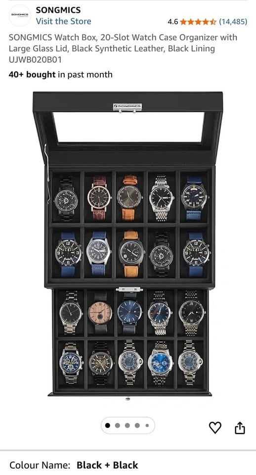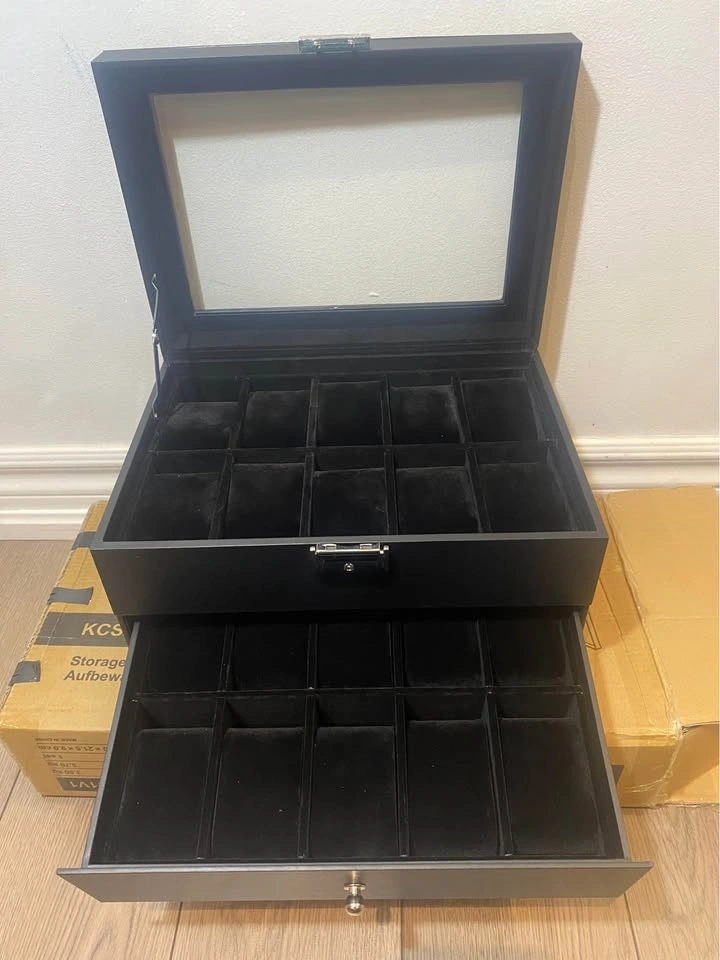 Spacious SONGMICS watch box with 20 slots for all your watches. Features 12 slots on top with a glass lid and 8 in a pull-out drawer. Made of black synthetic leather with white stitching. Handy for keeping your collection organized and safe. Measures 11.2" wide, 8.1" deep, and 6.5" tall. Fits watches with dial size up to 48 mm. Pick up in Pickering at Brock Road and Rex Heath Drive.