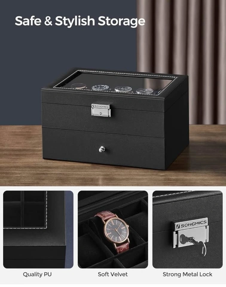 SONGMICS 20-Slot Watch Box Organizer Black Synthetic Leather