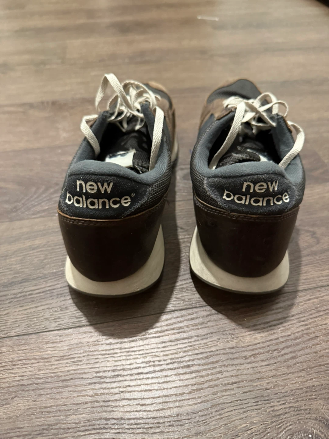 New Balance 485DG sneakers in a brown and grey colourway. US size 8.5, EU 42, UK 8, CM 26.5. Lace-up closure with textile and leather upper.