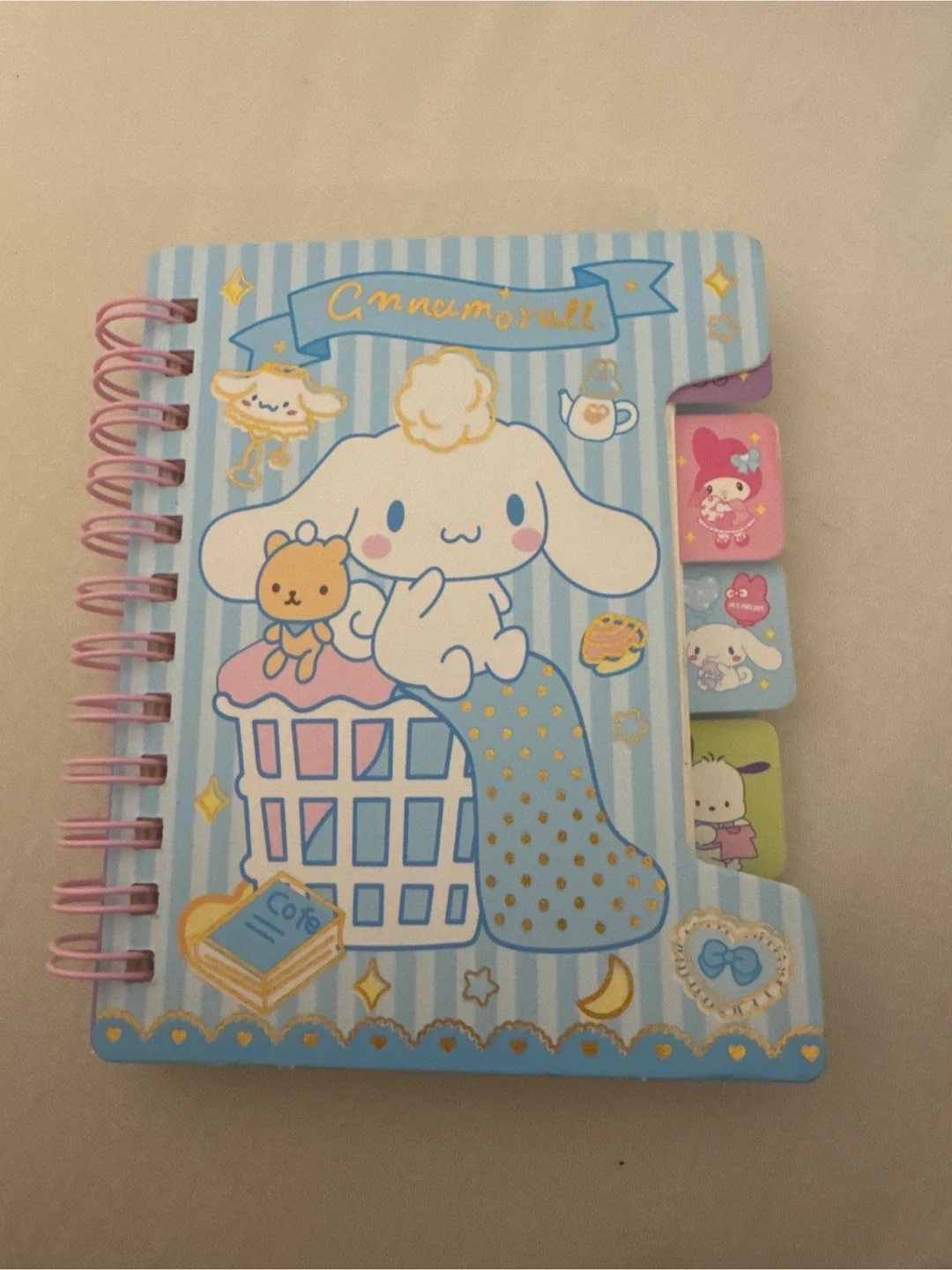 NOT USED! This cute spiral notebook features Cinnamoroll and friends on the cover. It includes lined pages for writing and tabbed dividers with character art. It's perfect for school notes or journaling!