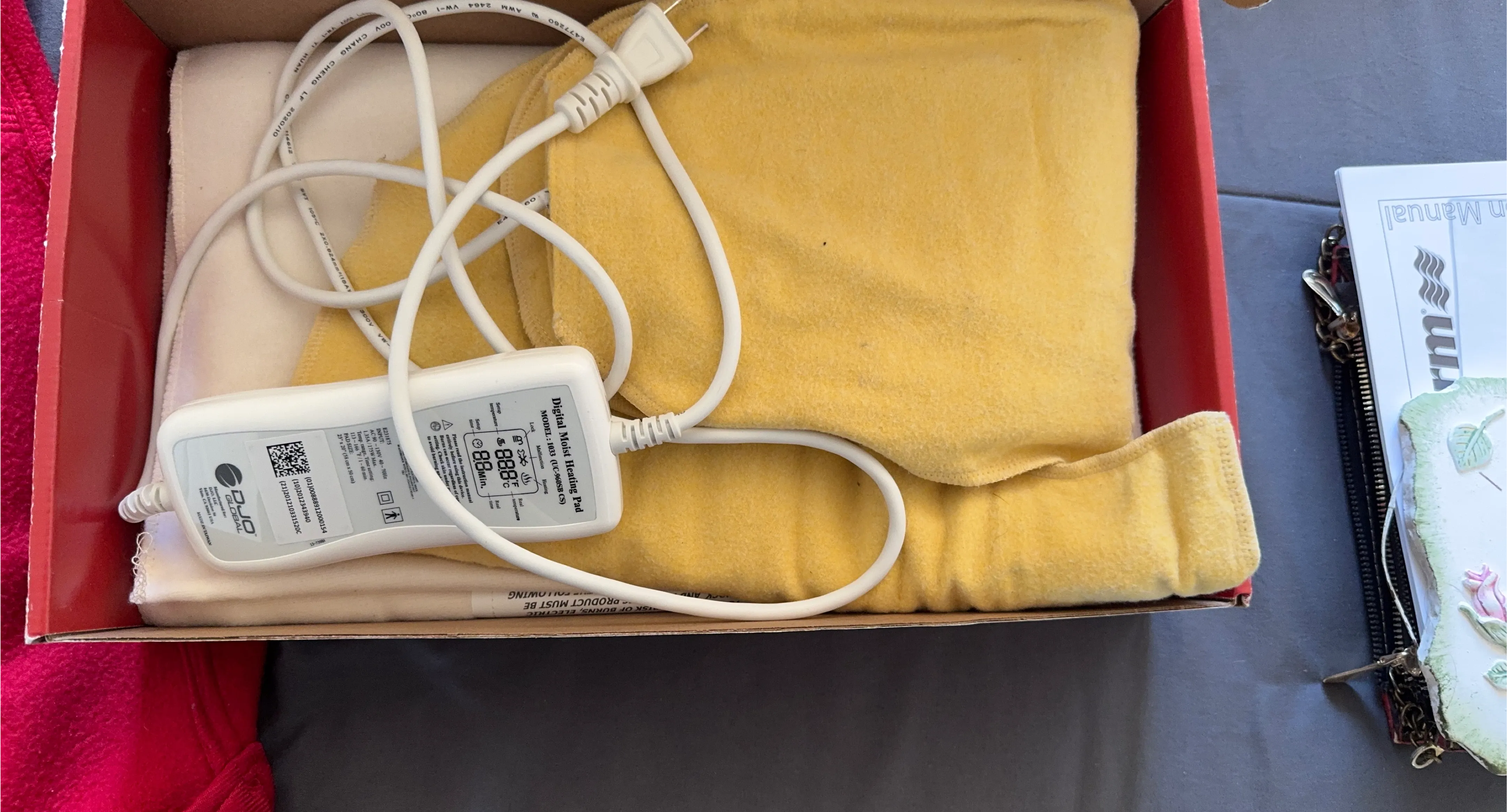 This Duo Global digital moist heating pad is model 1033. It measures 23" x 20" (58 cm x 50 cm). The heating pad has a temperature range of 113-166°F and a time setting of 1-60 minutes. It's made of a soft, yellow fabric. Includes original box and manual.