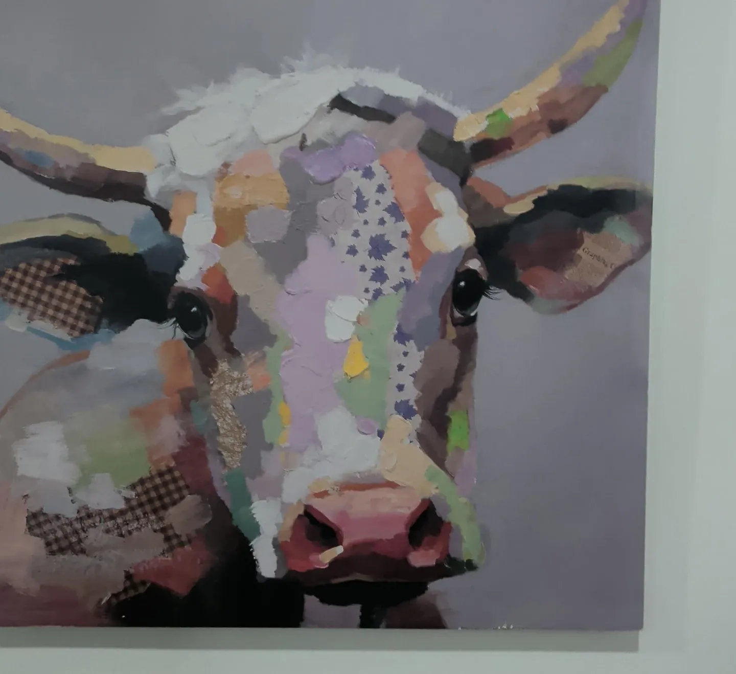 This is a vibrant and textured canvas print featuring a colourful cow. The artwork uses a collage of patterns and thick paint strokes for a unique look. It's a great piece to add personality to any room!