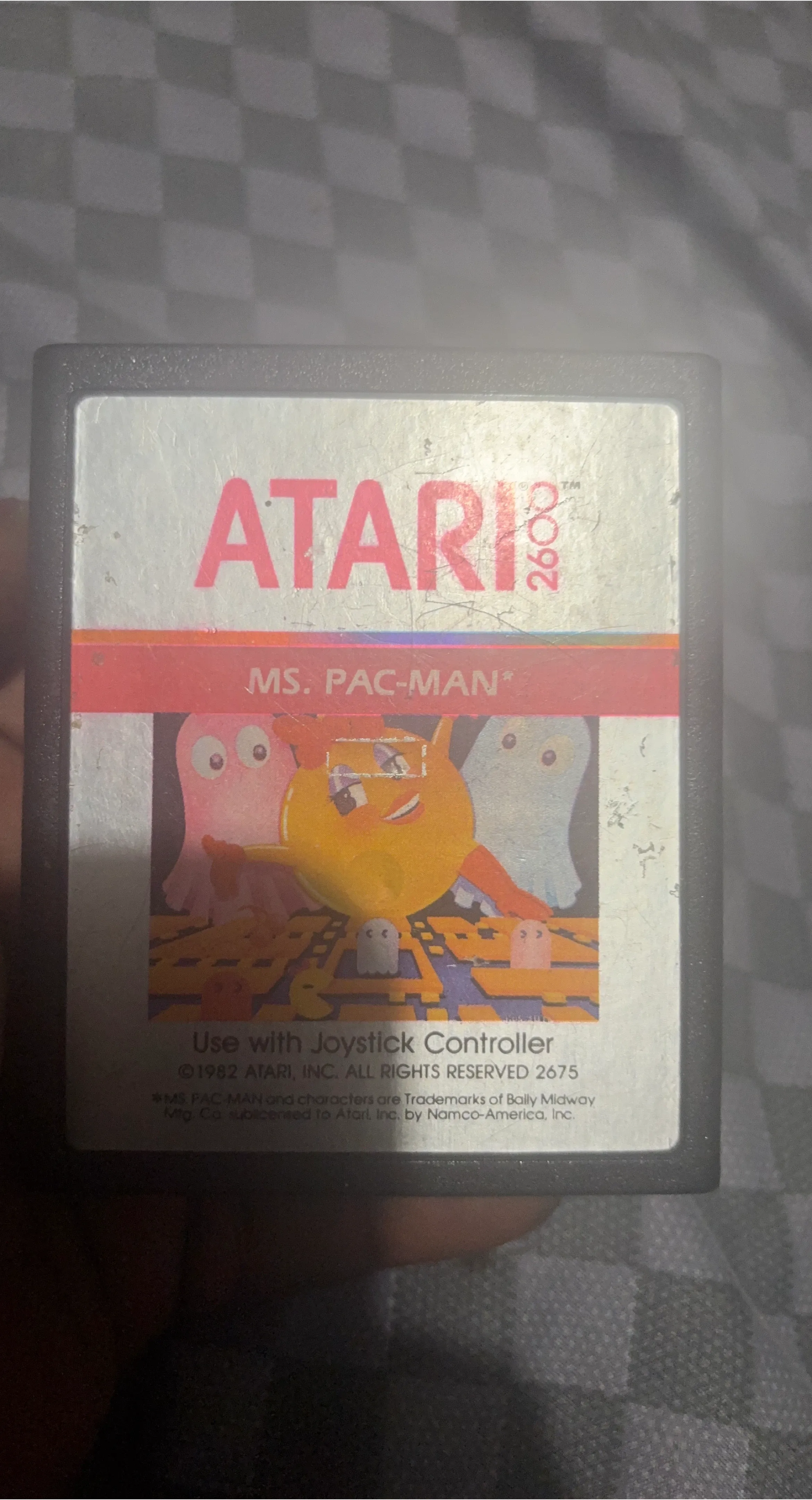 This is the Atari 2600 Ms. Pac-Man game cartridge. It's compatible with Atari 2600 joysticks. The game was published by Atari in 1982.