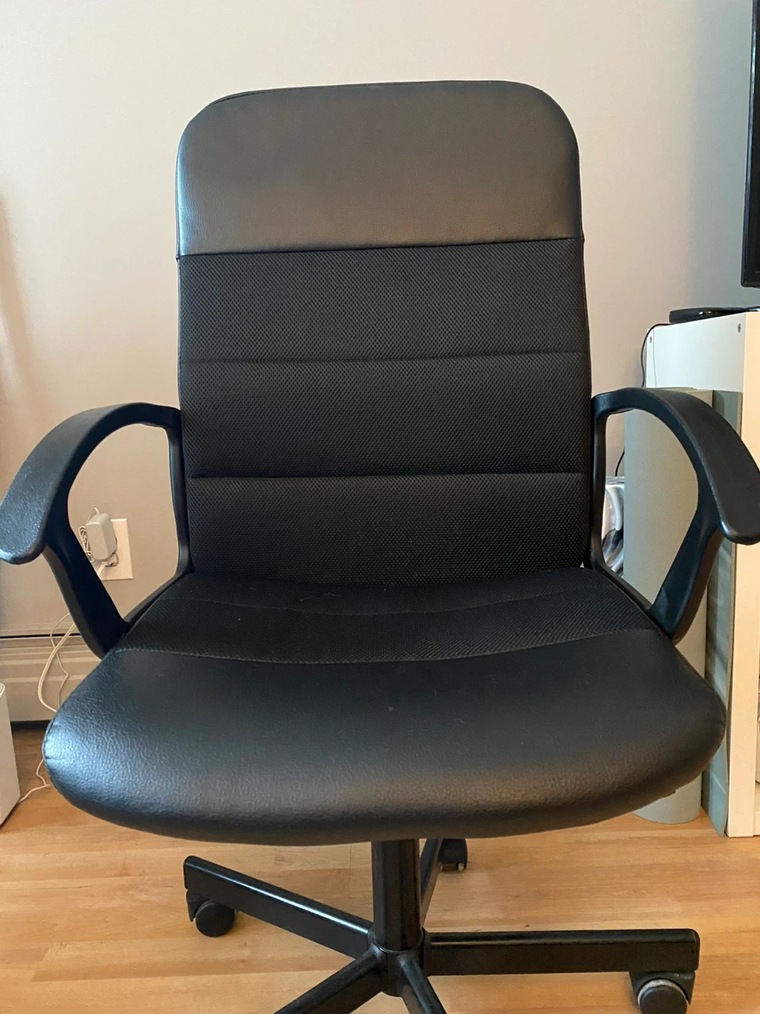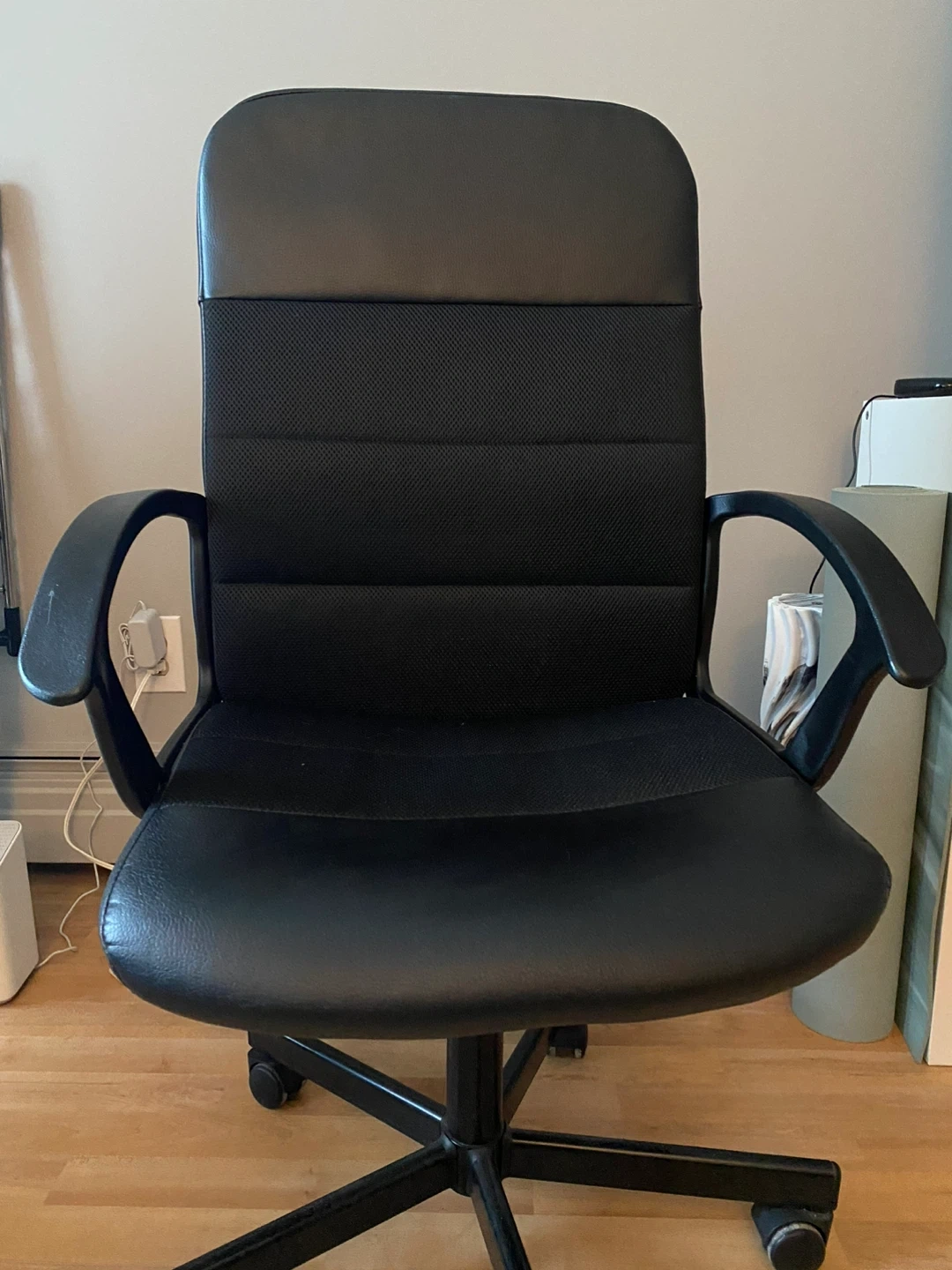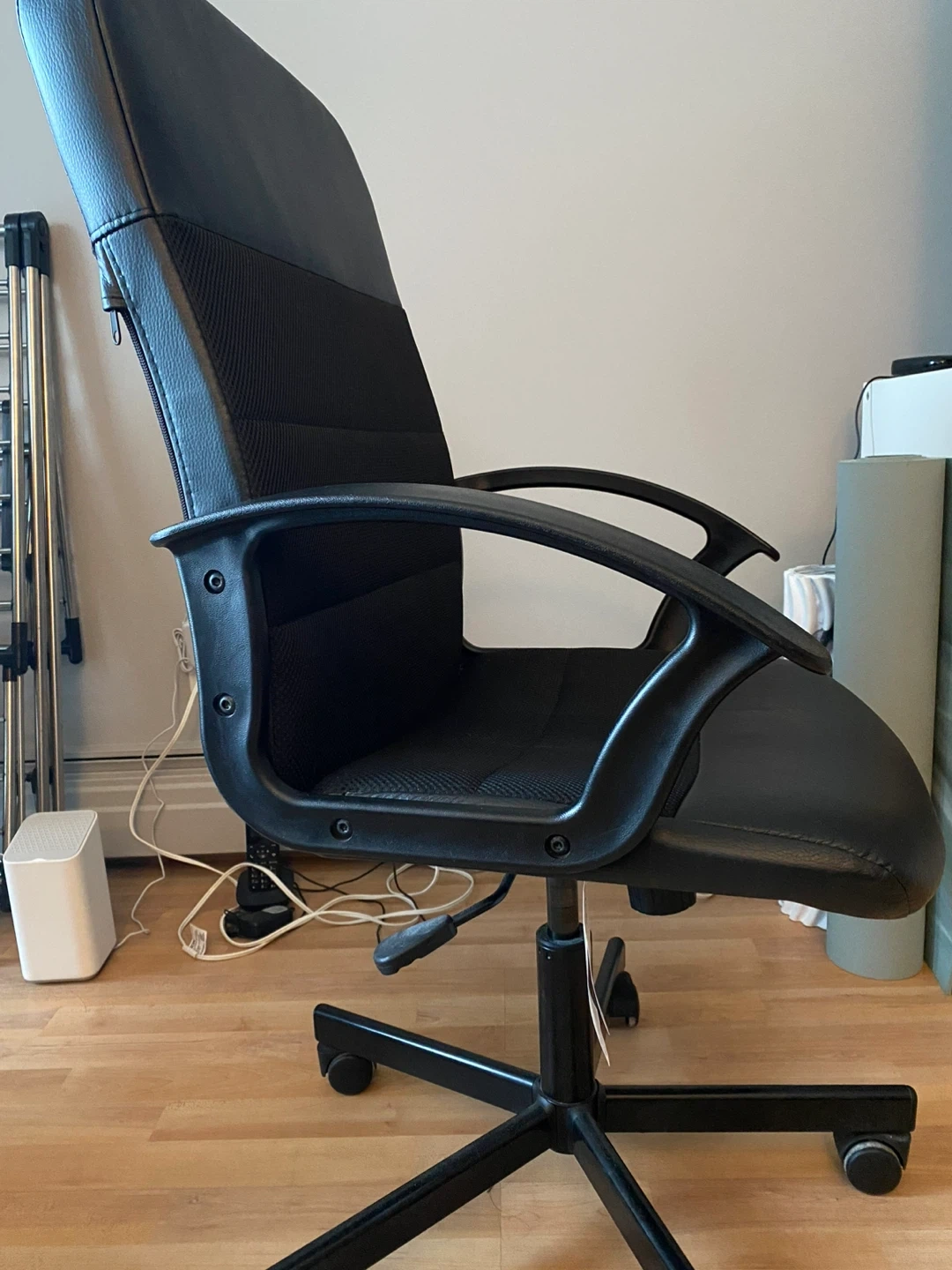 This is a black office chair with a comfortable padded seat and backrest. The chair features adjustable height and a swivel base with wheels for easy mobility. It's made with faux leather and mesh fabric for durability. This chair is great for home offices or workspaces!