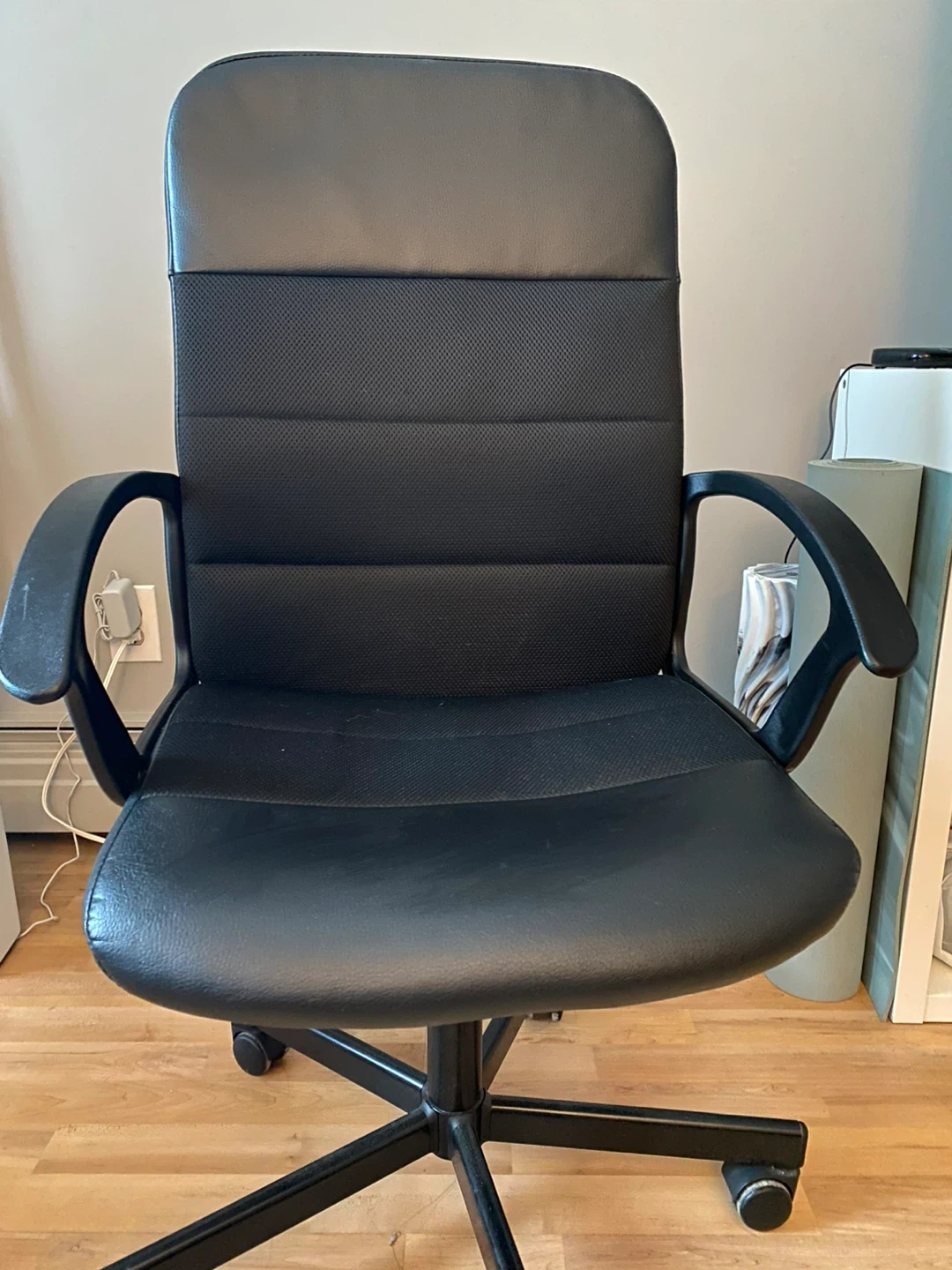 This is a black office chair with a comfortable padded seat and backrest. The chair features adjustable height and a swivel base with wheels for easy mobility. It's made with faux leather and mesh fabric for durability. This chair is great for home offices or workspaces!