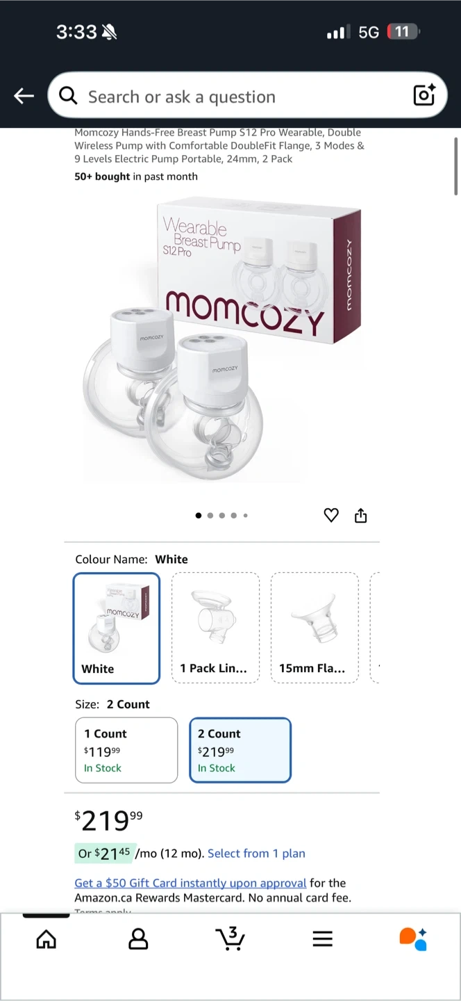 Selling a brand new Momcozy S12 Pro Wearable Breast Pump! It comes with a comfortable DoubleFit Flange and offers 3 modes with 9 levels of electric pumping power. It's portable and comes in a 2-pack. Colour is white, and the size is 2 count. Retails for $219.99