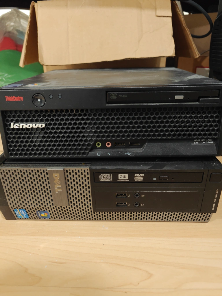 Two desktop computers, one Lenovo ThinkCentre and one Dell Optiplex 3010. Both have DVD-RW drives. Sold as is don't ask me the specs they're old as hell but believe functional.Good if u Wana scrap for parts or run an old Nas server or something.The disc drives alone worth keeping I'd say.
