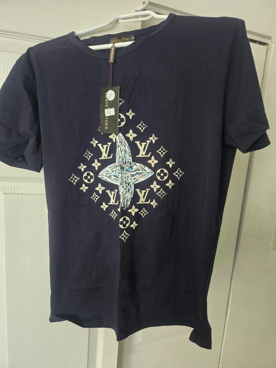 Navy blue t-shirt with Louis Vuitton monogram print and crystal design. Made from soft cotton material. Short-sleeved with a crew neck.