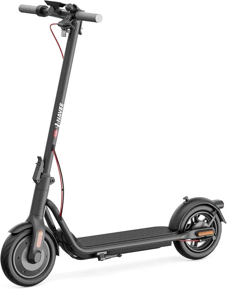 This is a RINAVEE electric scooter. It's black and made of metal. The scooter has two wheels and a handlebar for steering. It's ready for your next ride!