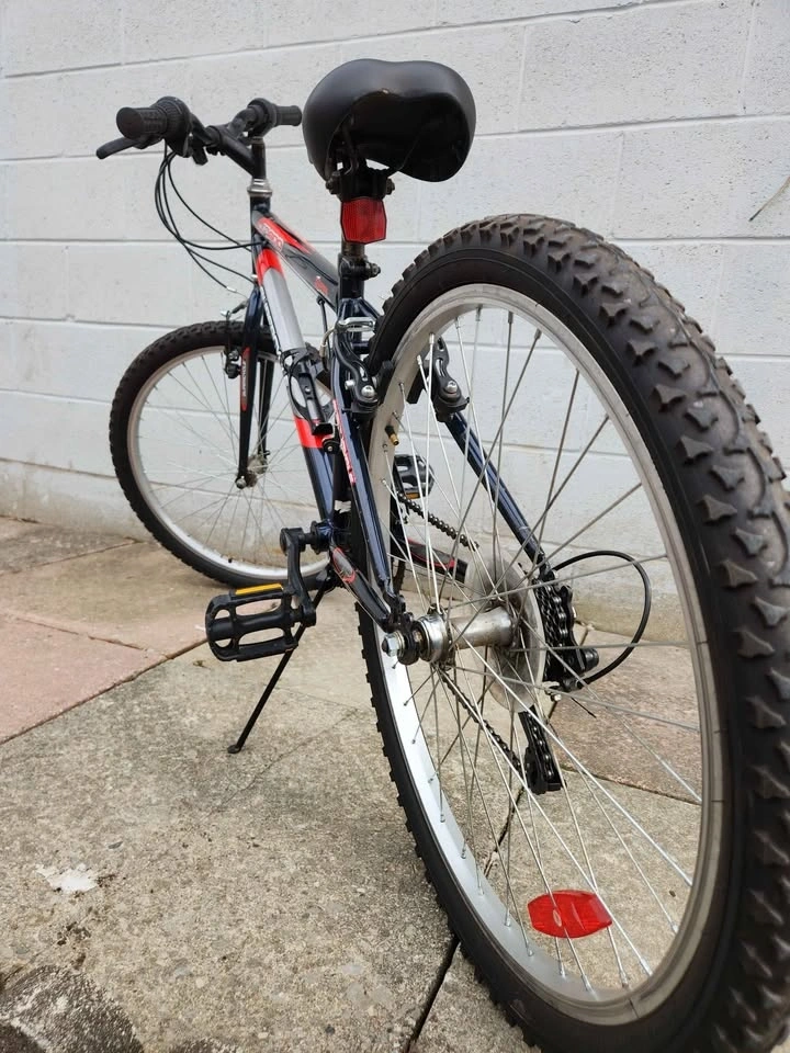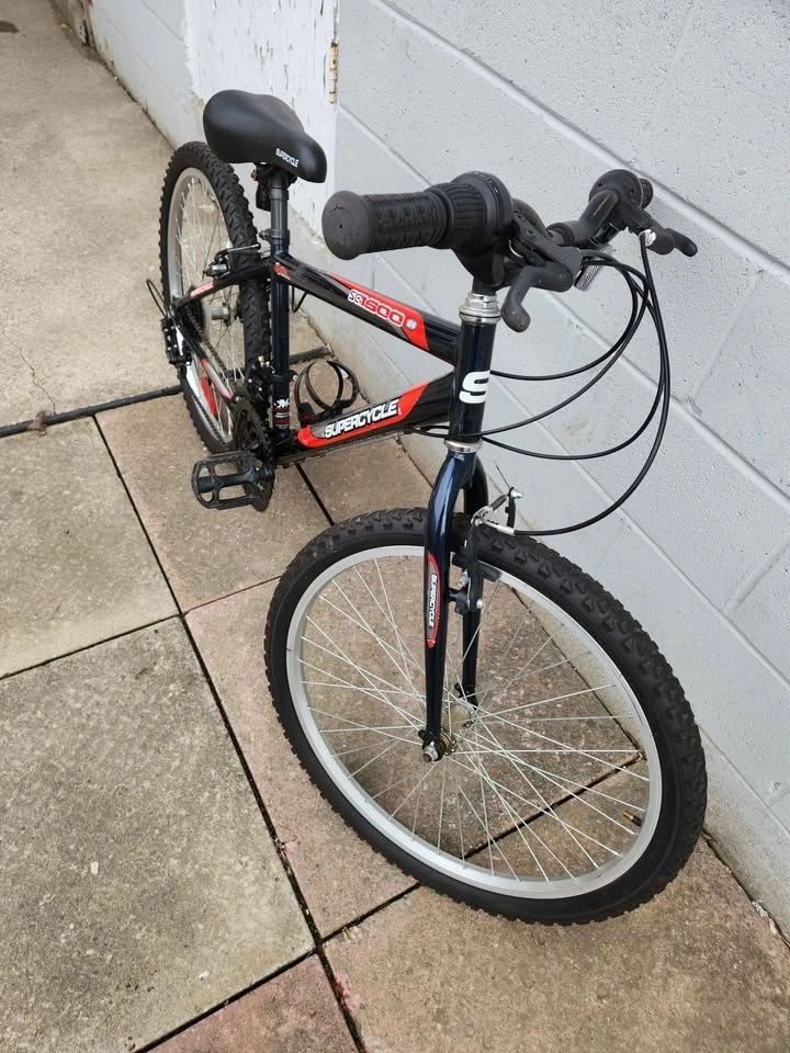 Sturdy Supercycle SG500 mountain bike with knobby tires, suitable for trails or street rides. Comes with a kickstand and water bottle holder. Great for getting around. 24 size chassis. Pick up location between Sheppard and Jane Street.