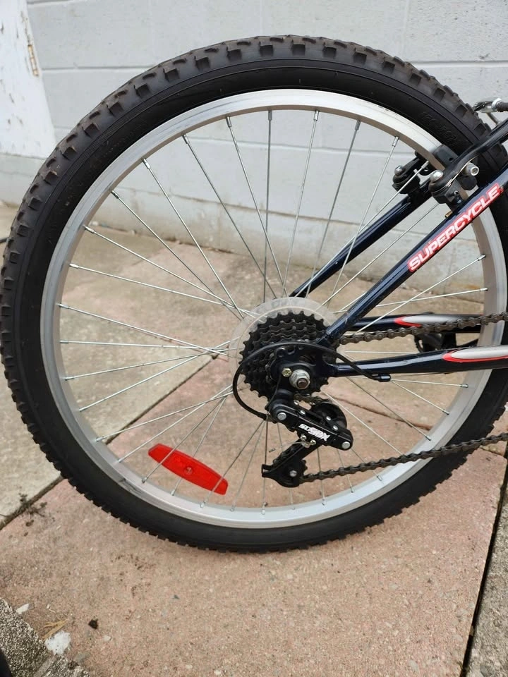 Sturdy Supercycle SG500 mountain bike with knobby tires, suitable for trails or street rides. Comes with a kickstand and water bottle holder. Great for getting around. 24 size chassis. Pick up location between Sheppard and Jane Street.