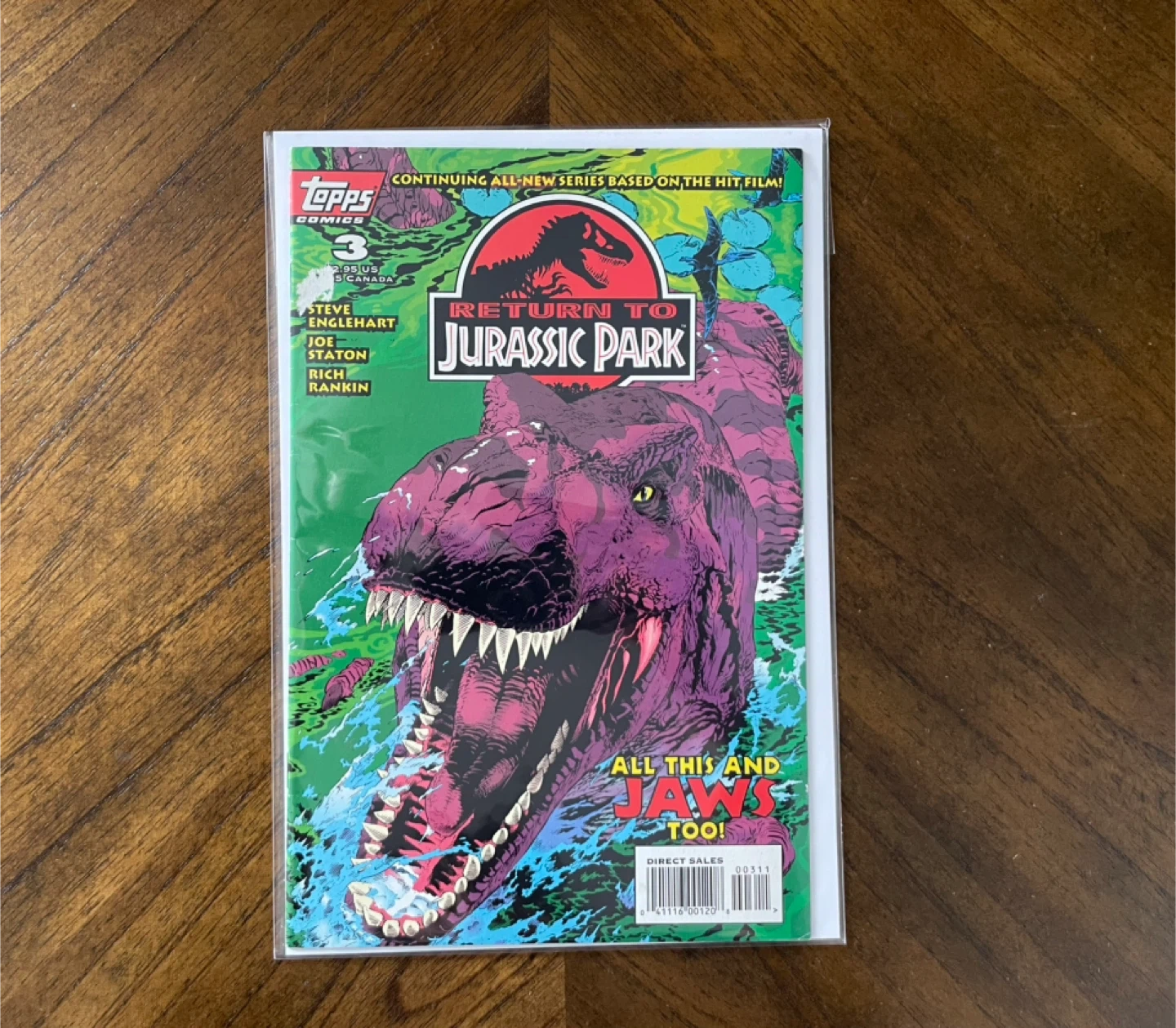 This is issue number 3 of the "Return to Jurassic Park" comic series. It's based on the hit film and features artwork by Steve Englehart, Joe Staton, and Rich Rankin. The cover includes the text "All This And Jaws Too!".