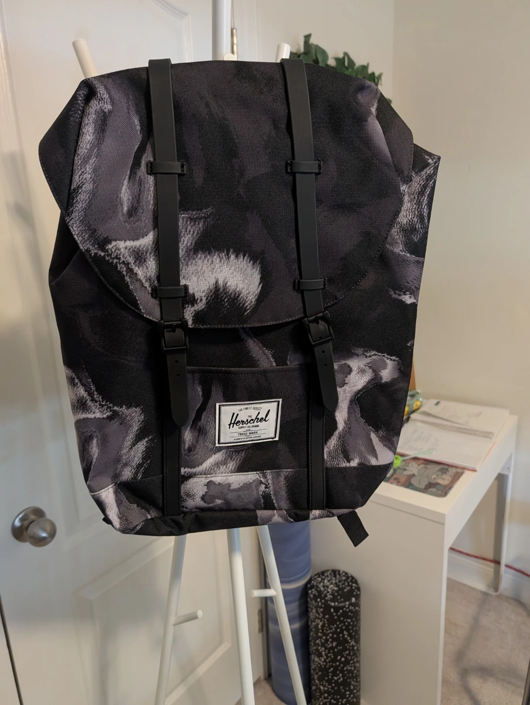 This Herschel backpack comes in a cool grey camouflage pattern. It features adjustable straps and a top flap closure. It's perfect for everyday use or short trips!