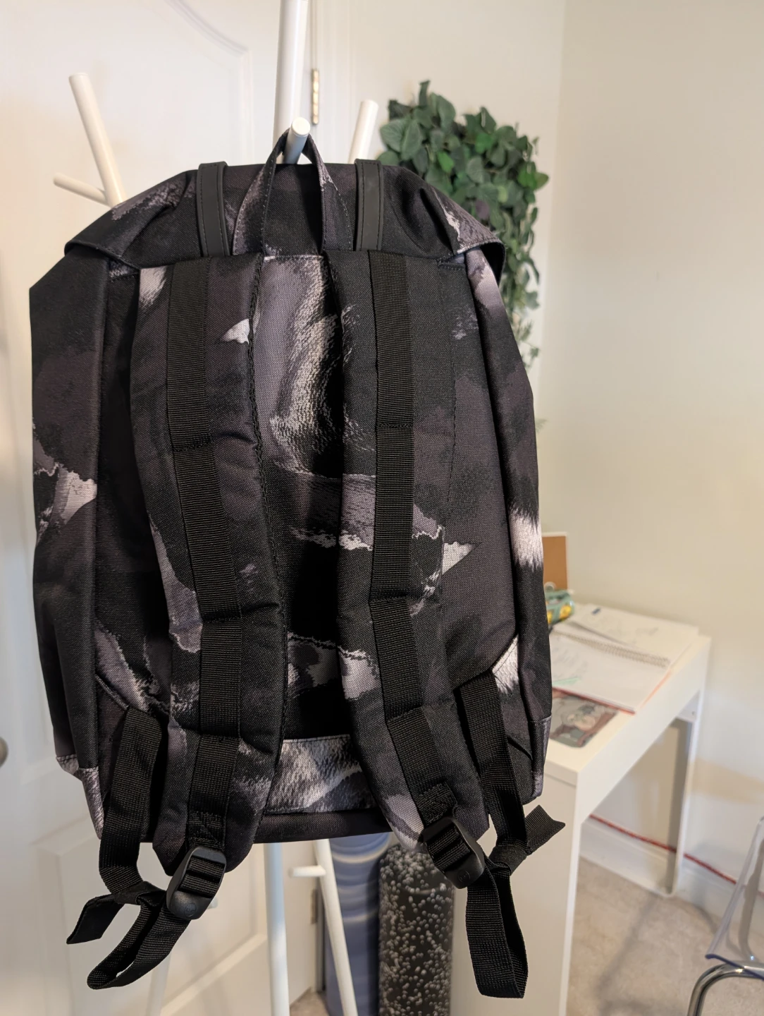 This Herschel backpack comes in a cool grey camouflage pattern. It features adjustable straps and a top flap closure. It's perfect for everyday use or short trips!