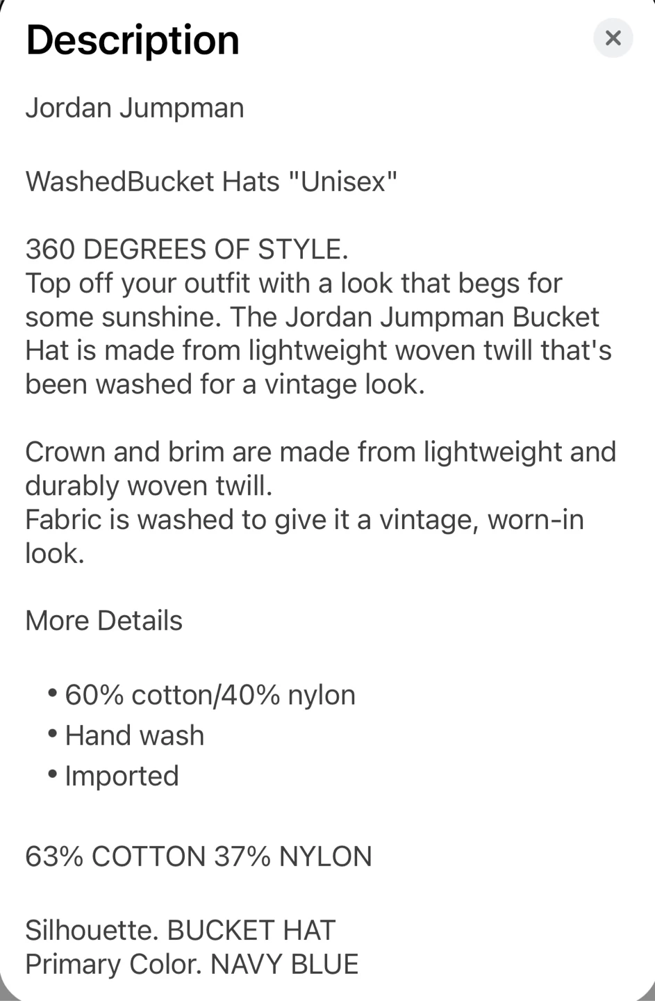 This is a Adult Unisex Jordan Jumpman Washed Bucket Hat. It's made from a 60% cotton and 40% nylon blend.