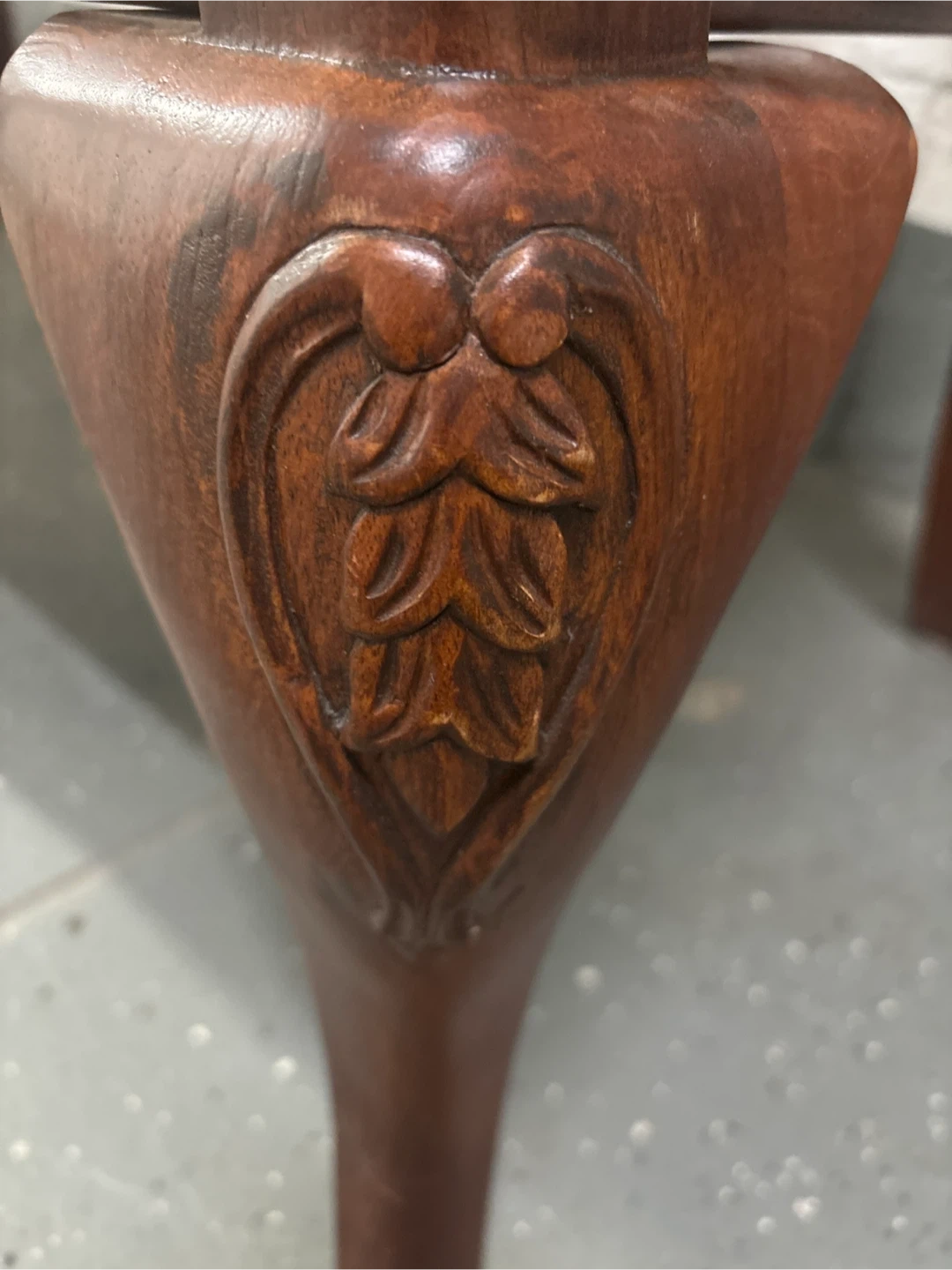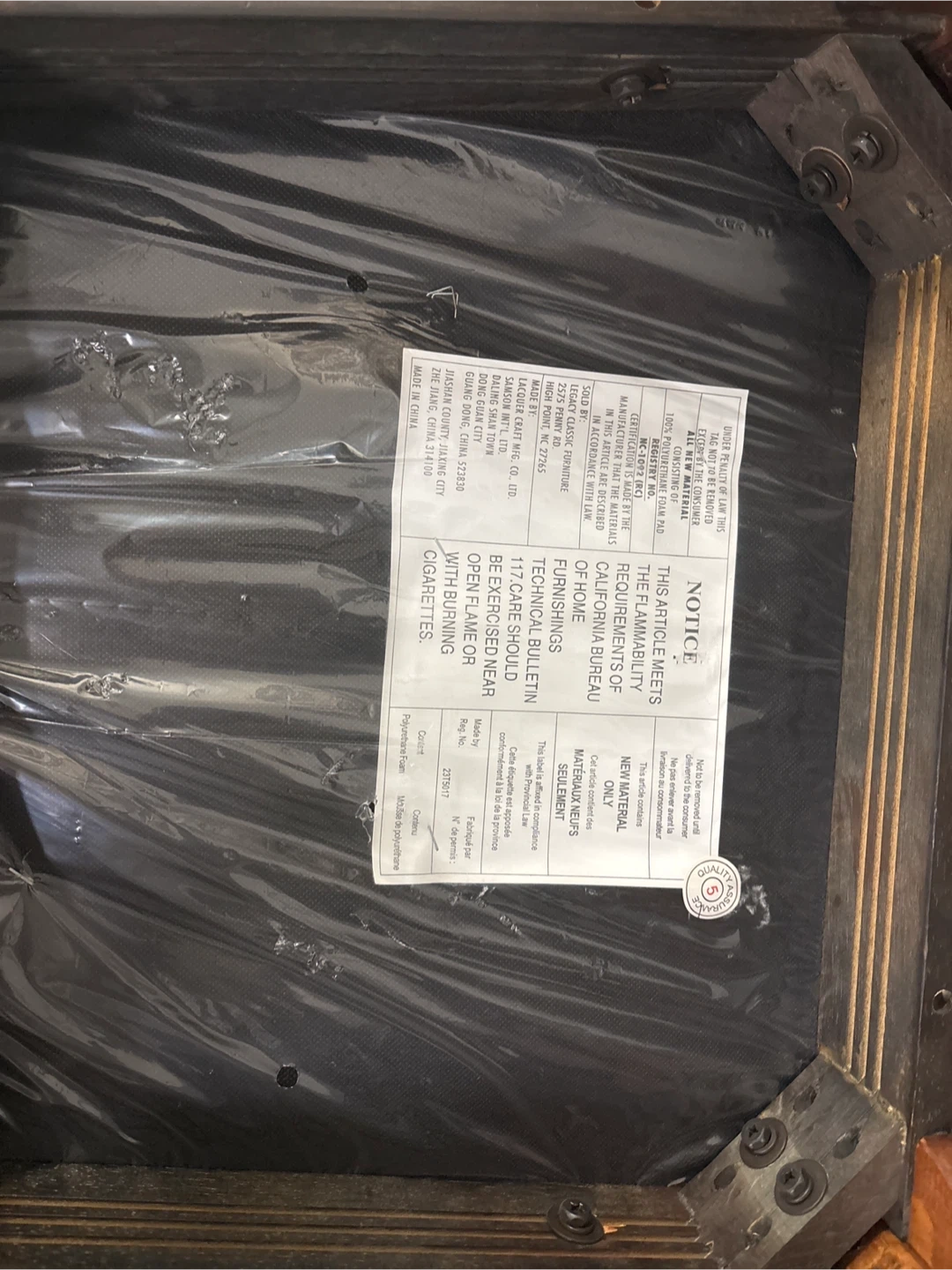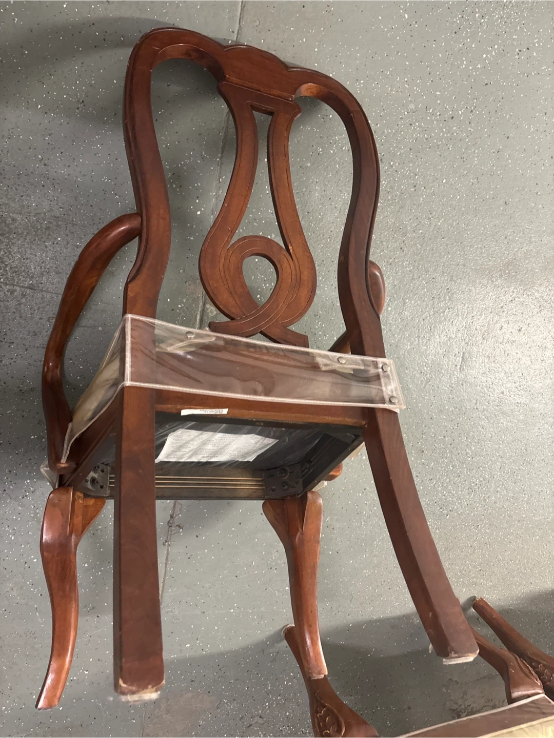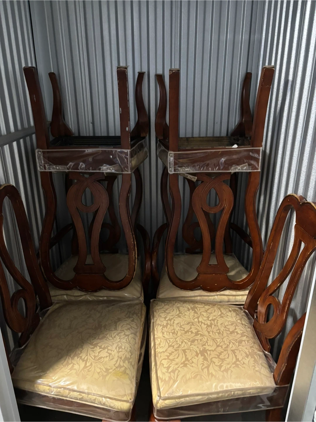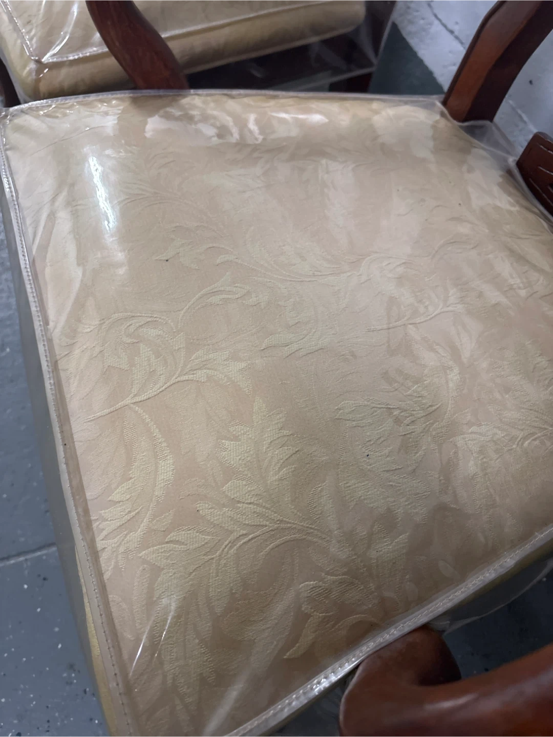 Selling a set of 6 vintage dining chairs. They have a beautiful wood finish and a classic design that would look great in any dining room. The seats are covered in a patterned fabric and are still wrapped in plastic, keeping them clean and protected!