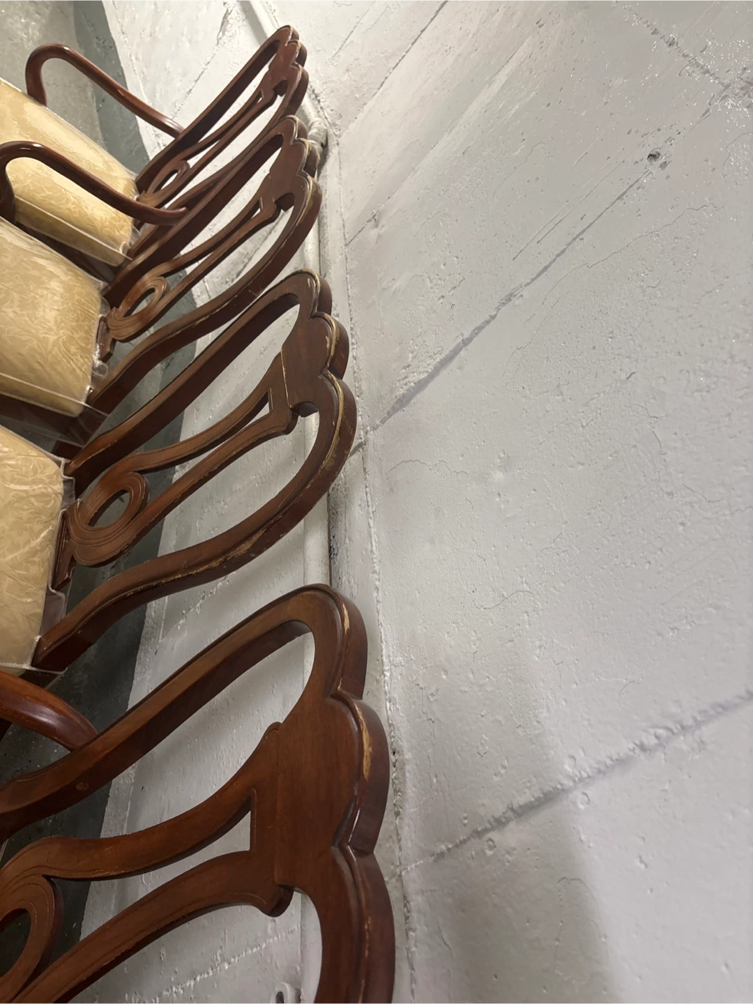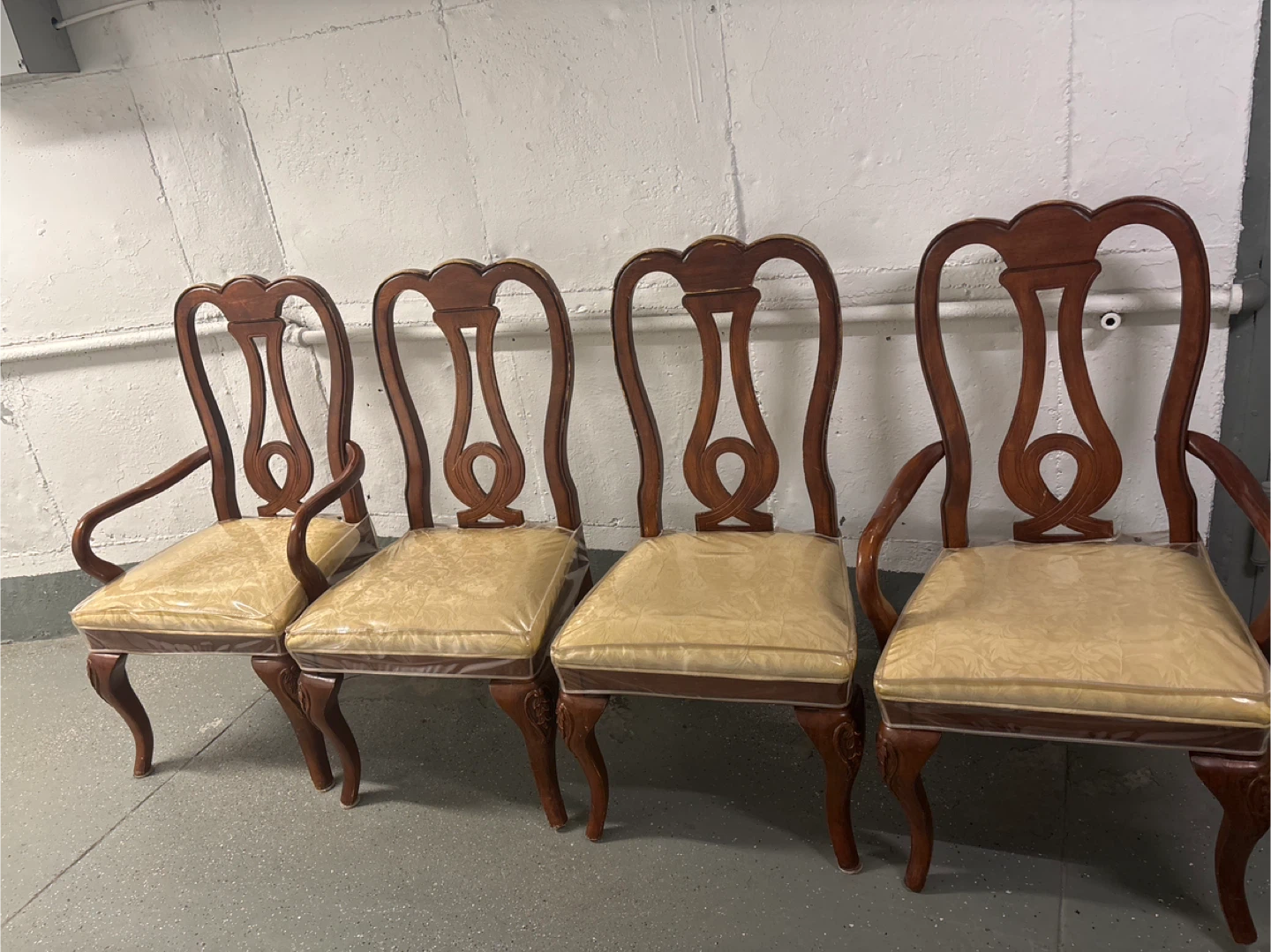 Selling a set of 6 vintage dining chairs. They have a beautiful wood finish and a classic design that would look great in any dining room. The seats are covered in a patterned fabric and are still wrapped in plastic, keeping them clean and protected!