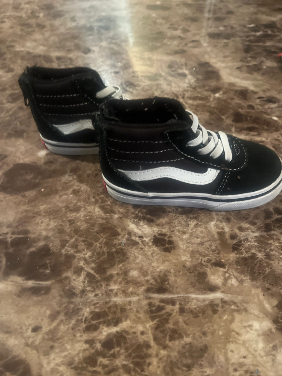 These toddler Vans Sk8-Hi Zip shoes are in great condition! They feature the classic black and white design with a convenient zipper at the back for easy on and off. Perfect for your little one's adventures!