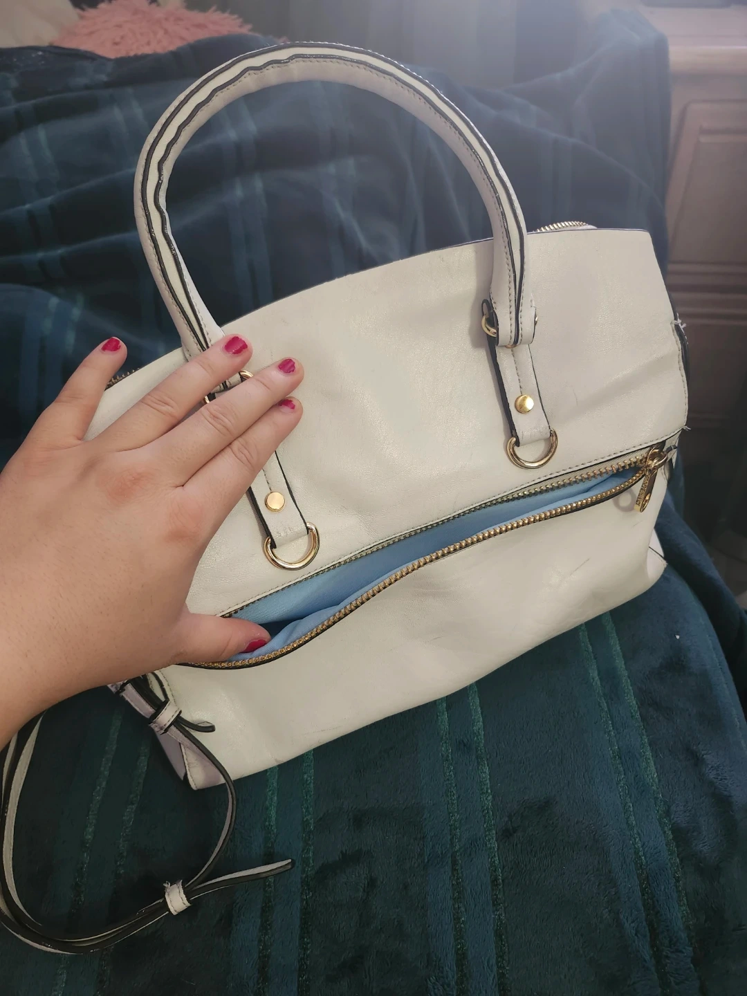 This White Leather Satchel Handbag has a light blue lining and 3 interior pockets and 1 external pocket. It includes a detachable shoulder strap and gold-tone hardware. It's a versatile bag for everyday use.