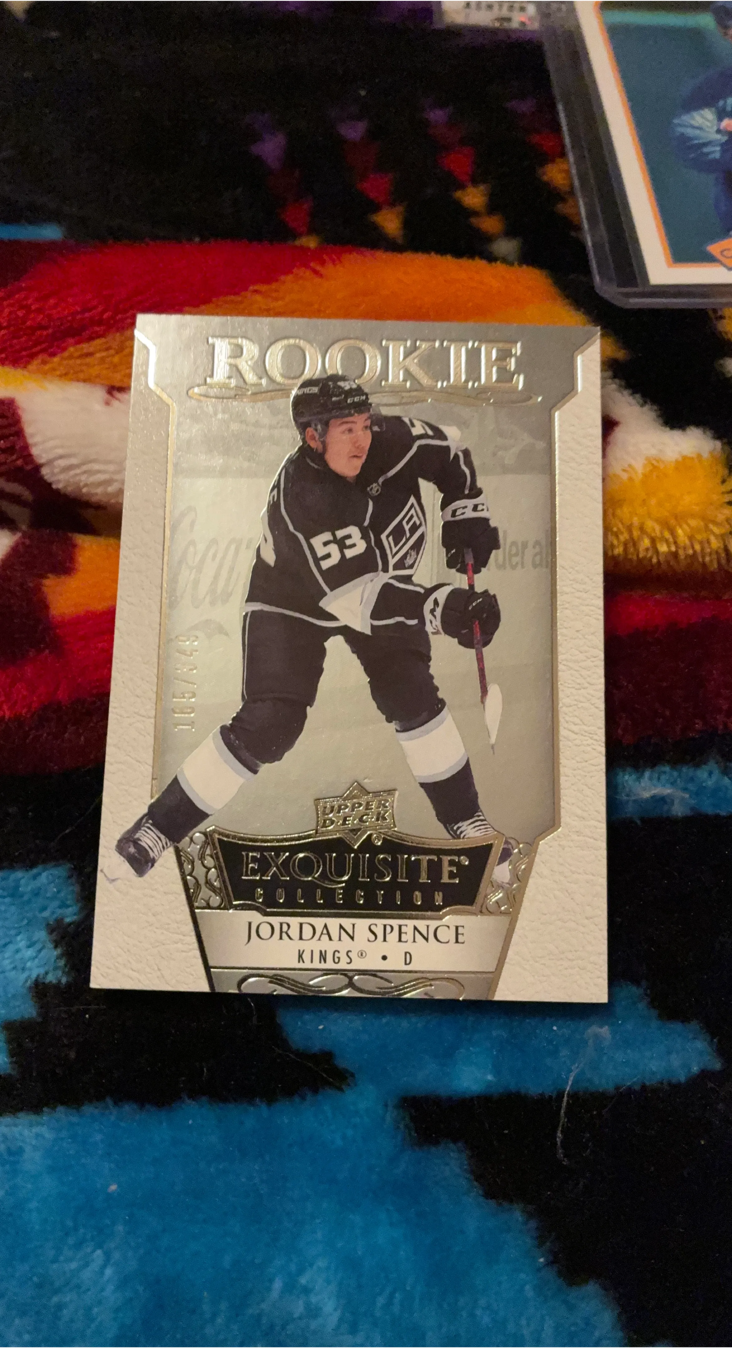 This is a 2022-23 Upper Deck Exquisite Collection Rookie card featuring Jordan Spence of the LA Kings. It's card number 165 out of 848. This is a great card for any hockey collector!