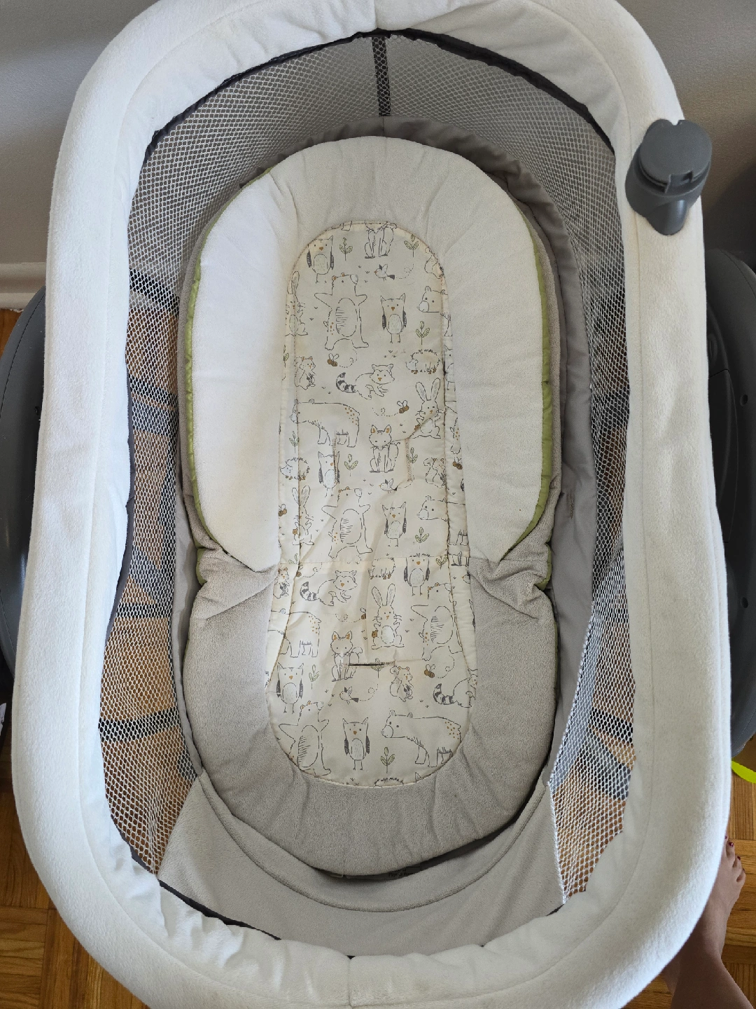 Gently used Graco baby bassinet in great condition! Perfect for newborns and infants. The bassinet is white and gray. It features a comfortable sleeping area for your little one and a sturdy base for safety. Seriously amazing. Gave our baby great sleep until he grew out of it. Needs batteries, we have some in there with juice but the aux cord doesn't work.