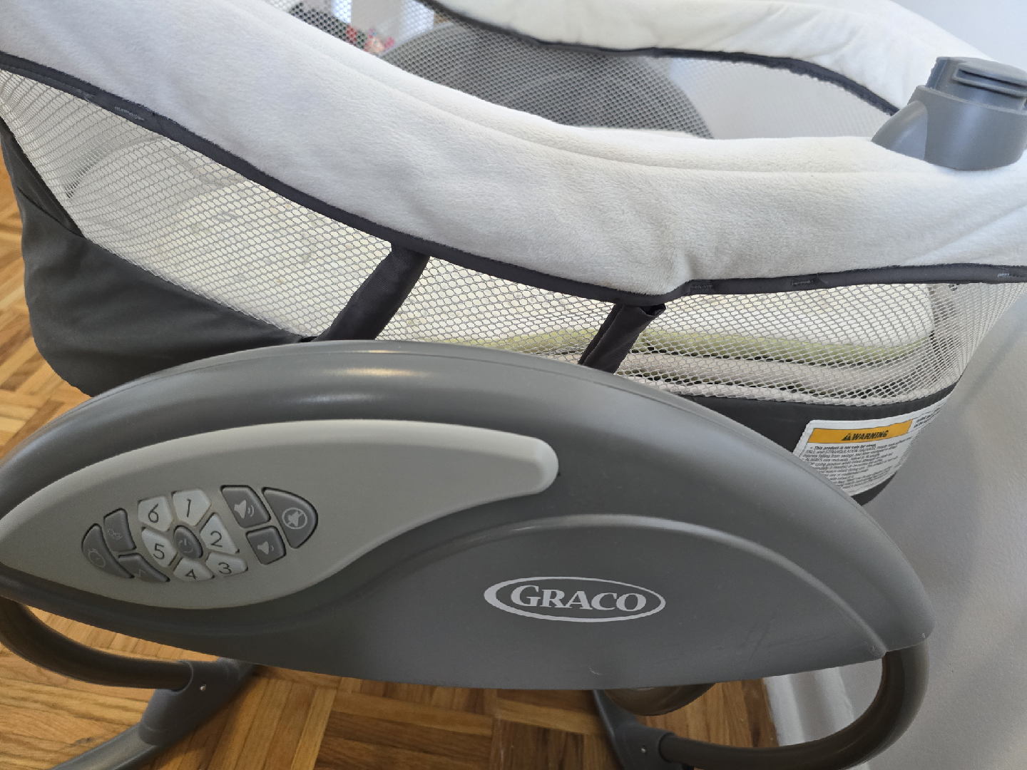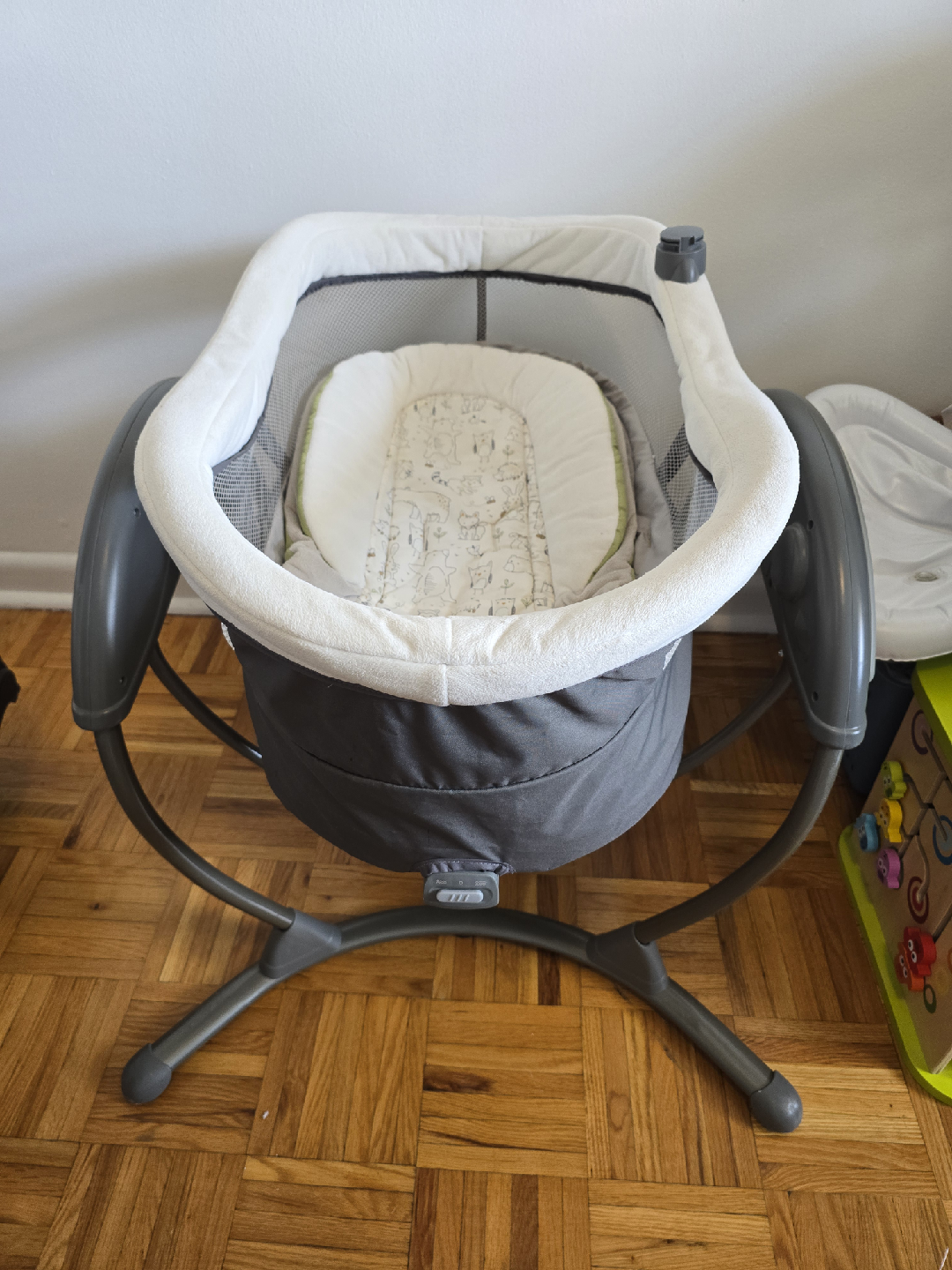 Gently used Graco baby bassinet in great condition! Perfect for newborns and infants. The bassinet is white and gray. It features a comfortable sleeping area for your little one and a sturdy base for safety. Seriously amazing. Gave our baby great sleep until he grew out of it. Needs batteries, we have some in there with juice but the aux cord doesn't work.
