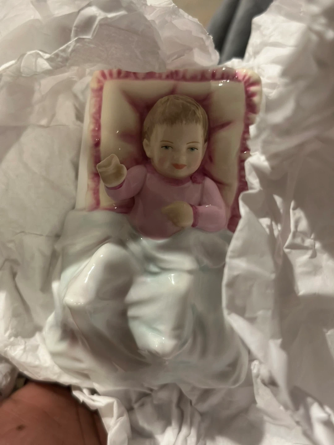 This is a Royal Doulton Christening Girl figurine, model HN 5161. It's a porcelain piece depicting a baby in a crib. It comes with its original packaging and documentation.