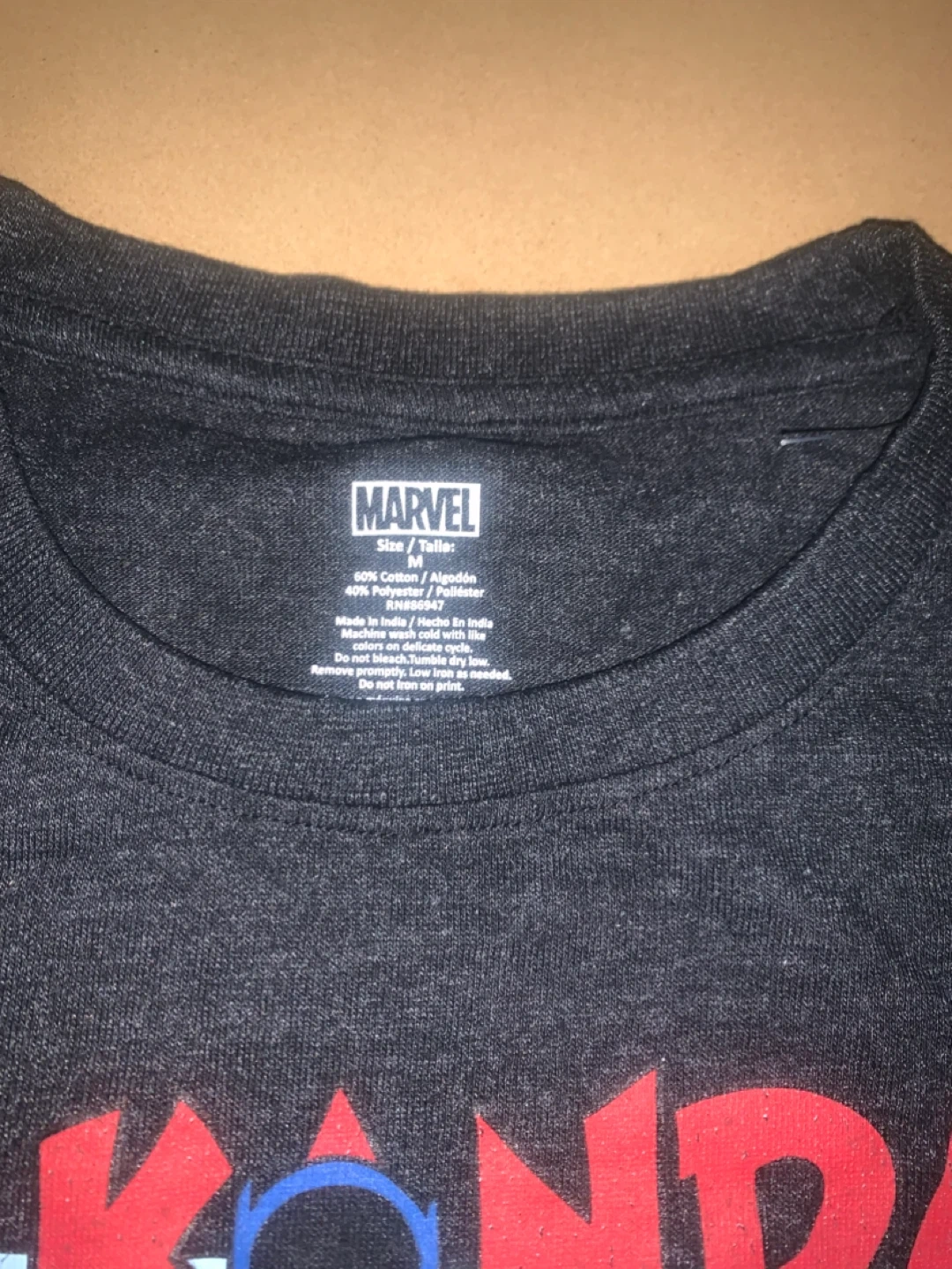 This Marvel t-shirt features Black Panther with a Wakanda Forever graphic. It's made of 60% Cotton and 40% Polyester. Size medium.