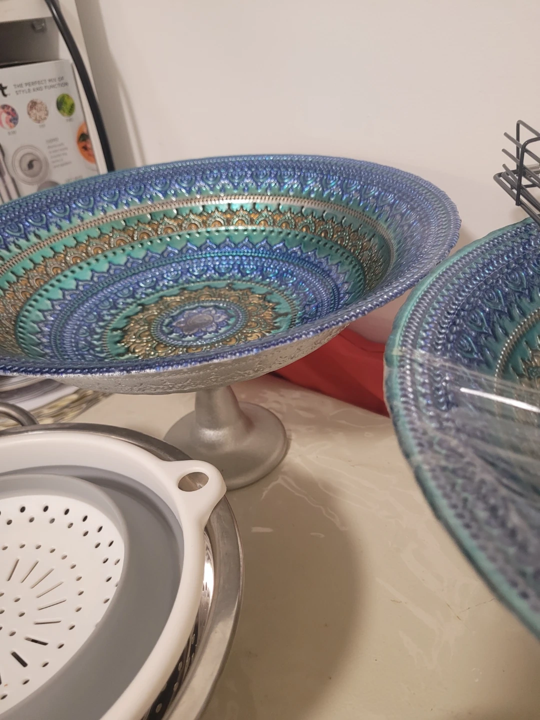 This set includes two decorative blue serving bowls with intricate patterns, a stainless steel colander, and a clear glass divided serving platter embossed with roses. Also includes a white plastic handled strainer. Some items are still in protective wrapping. Everything for $30