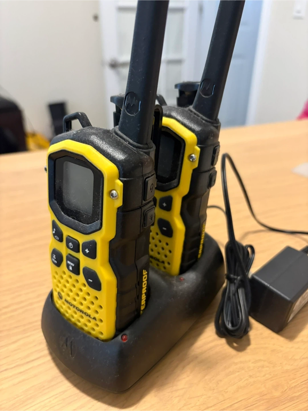 Two Motorola Talkabout two-way radios in yellow and black. Includes charging base and adapter. These radios are ready for your next adventure!