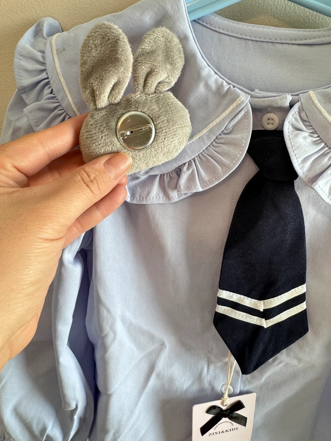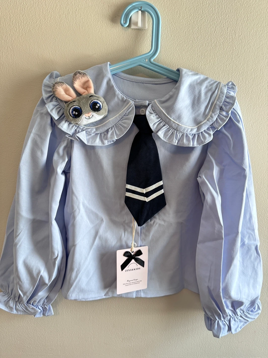 This ZIXI&KIDS set includes a blue plaid skirt with Zootopia Judy patch and a light blue blouse with a detachable Judy brooch and tie. It's perfect for a little one's themed outfit.
