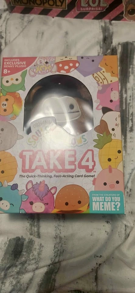 Squishmallows Take 4 card game! This one includes an exclusive Benny plush. Super fun quick-thinking, fast-acting game for ages 8+. Opened but never played.