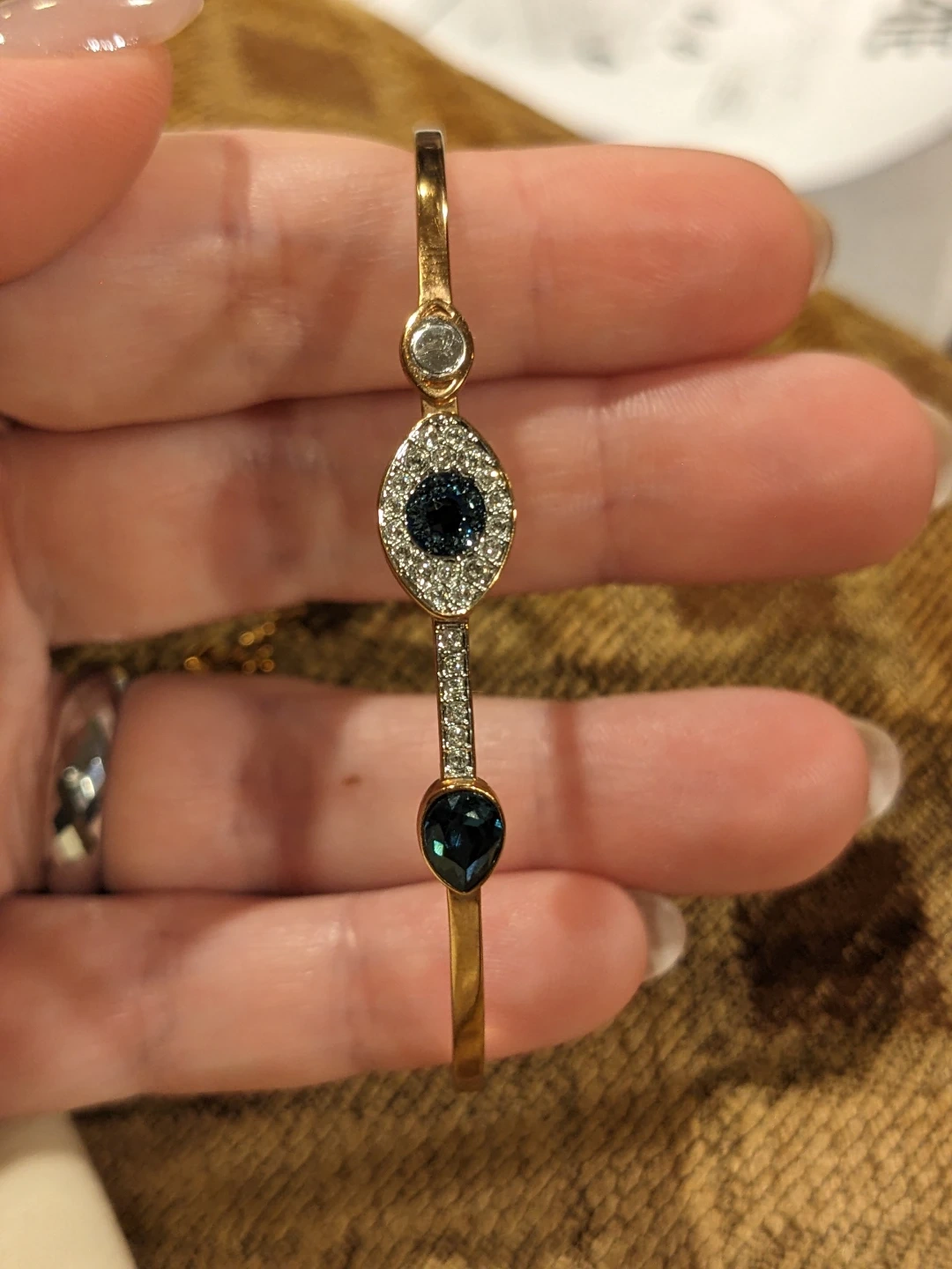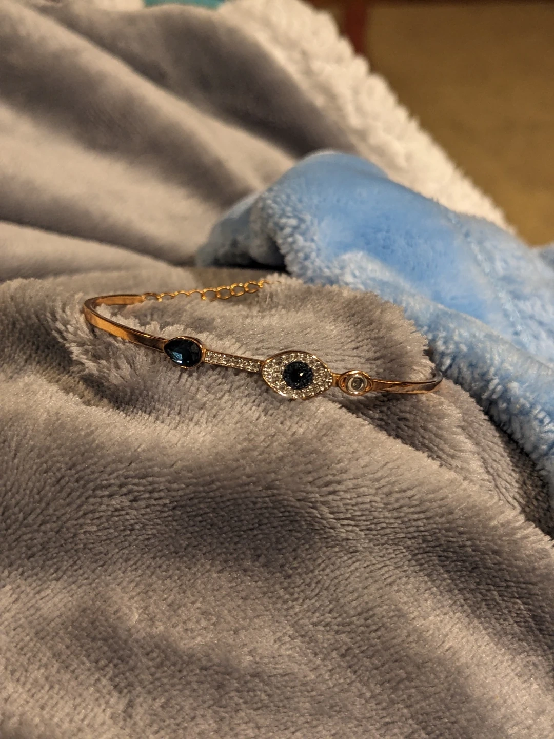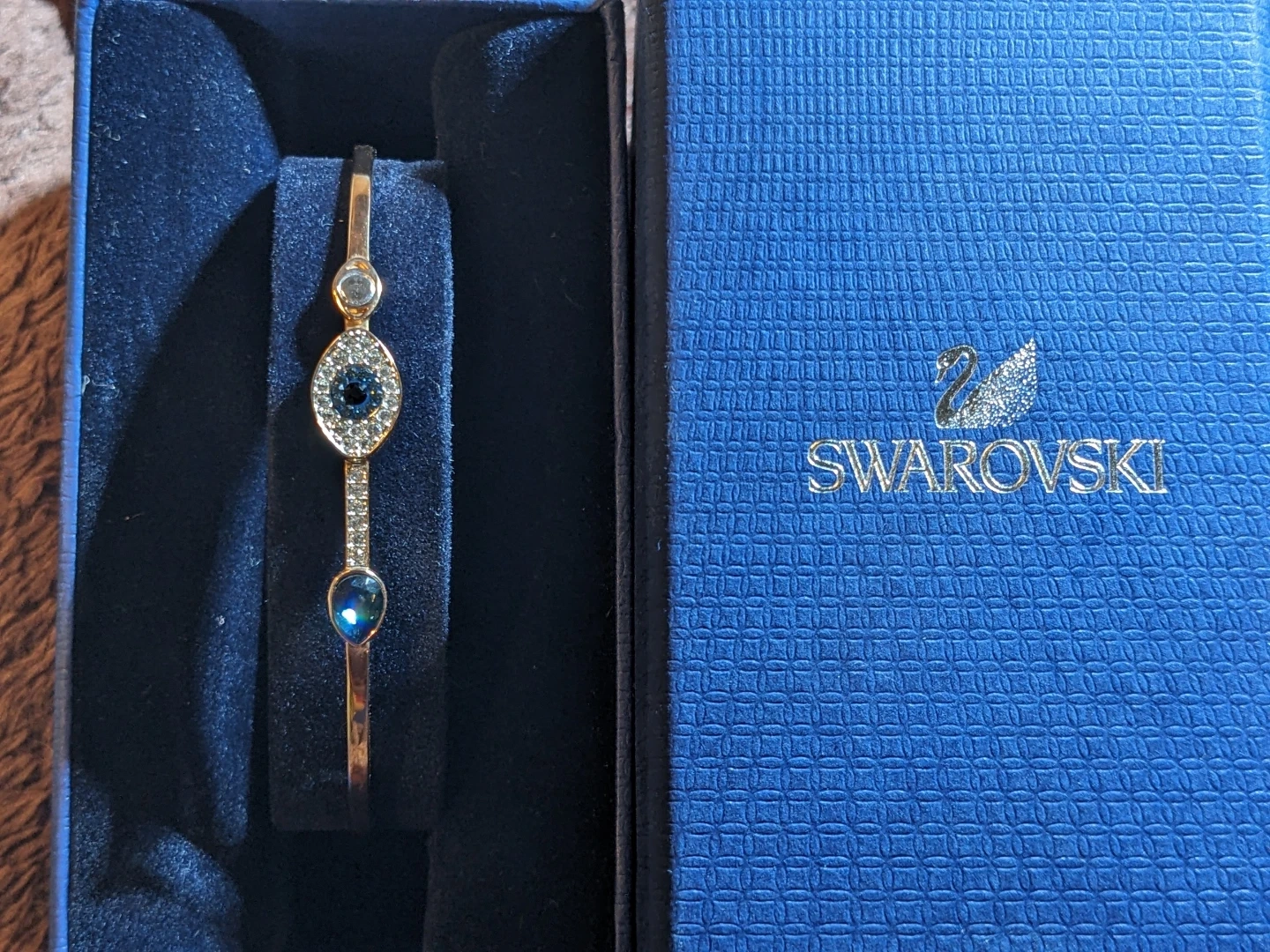 This beautiful Swarovski rose gold tone bangle bracelet features an evil eye design with blue and clear crystals. It has a lobster clasp and an adjustable chain for a comfortable fit.