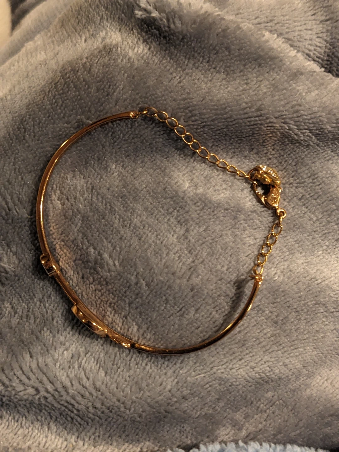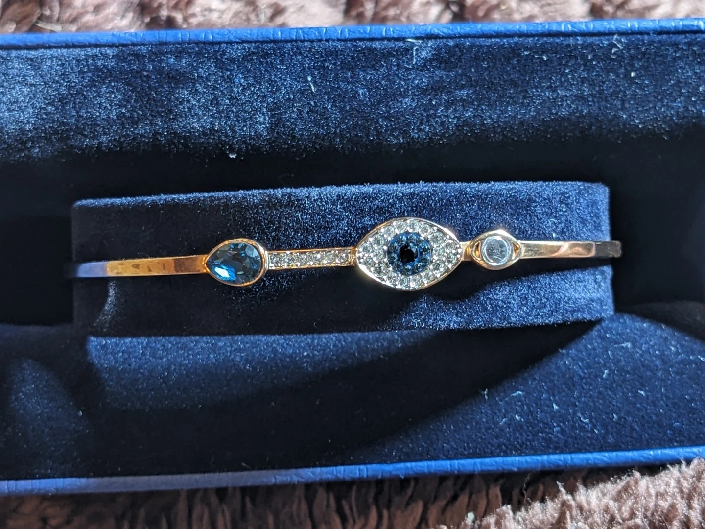 This beautiful Swarovski rose gold tone bangle bracelet features an evil eye design with blue and clear crystals. It has a lobster clasp and an adjustable chain for a comfortable fit.