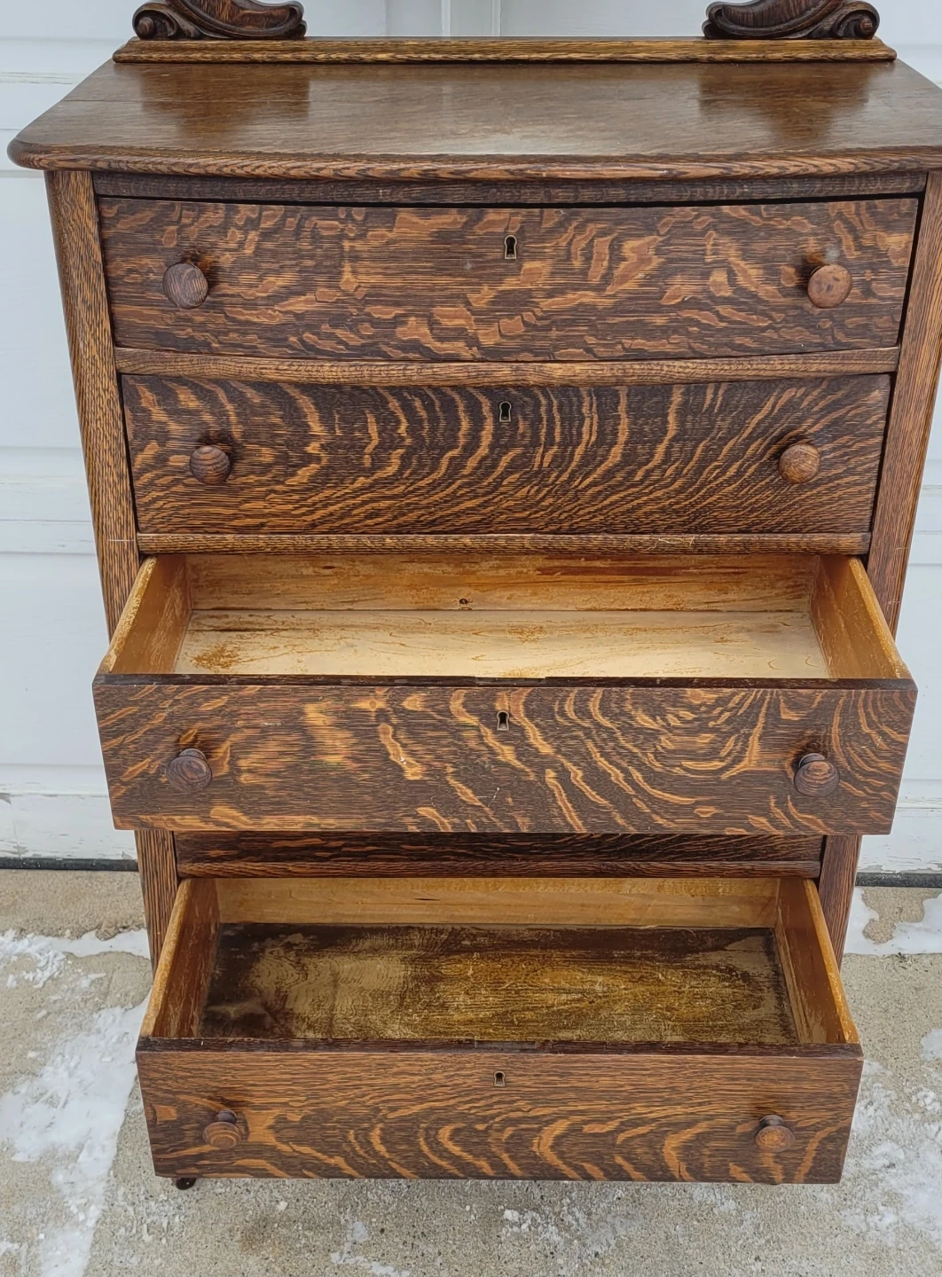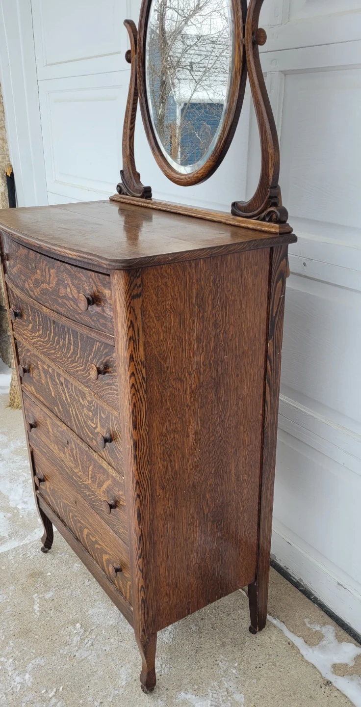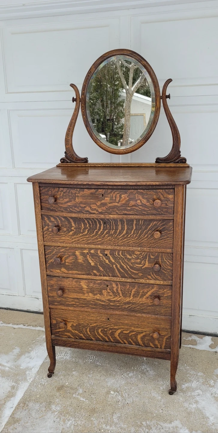 Antique tiger oak 5 drawer highboy dresser and mirror on brass wheels. Wheels roll very well and drawers slide nicely. Each drawer has a skeleton key lock. In good condition.