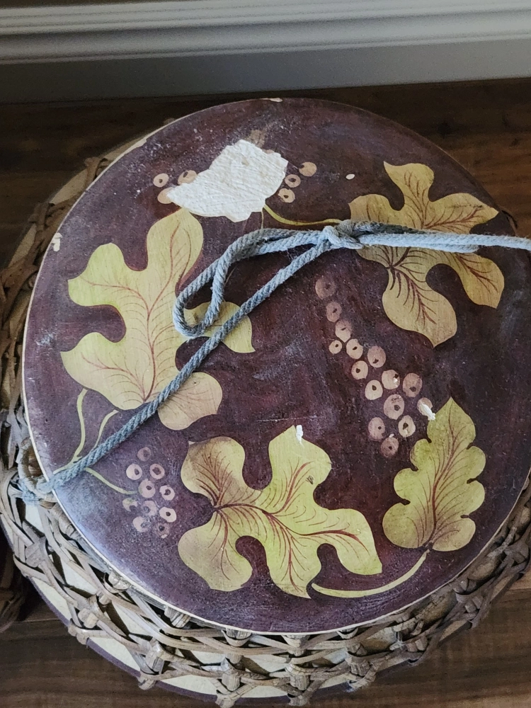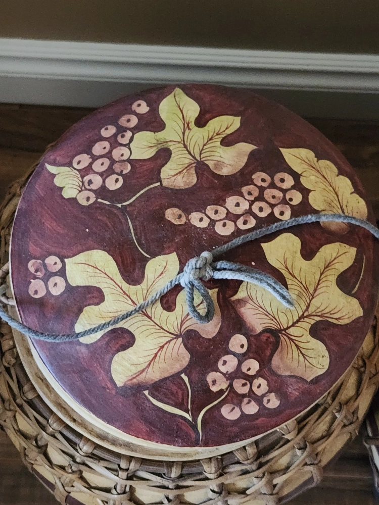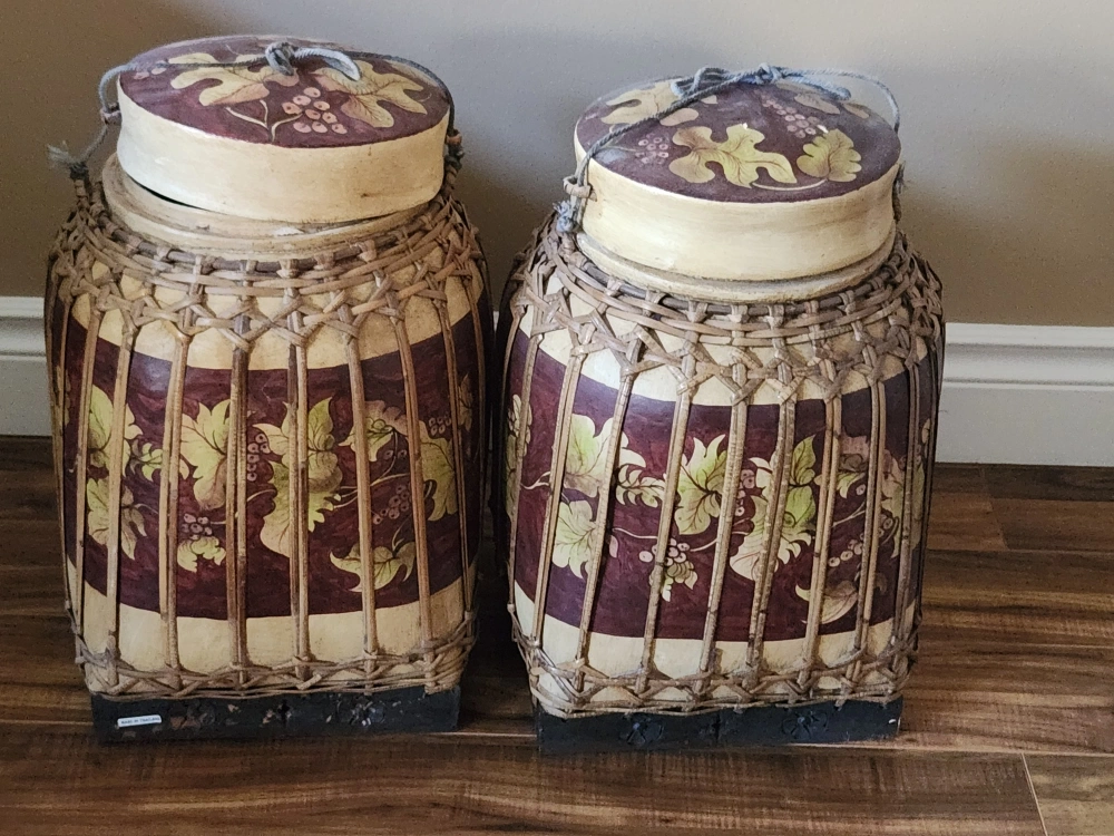 Two matching containers. Hand-painted grapevine design. Woven bamboo construction. Lids secured with twine. Unique home decor or storage solution.