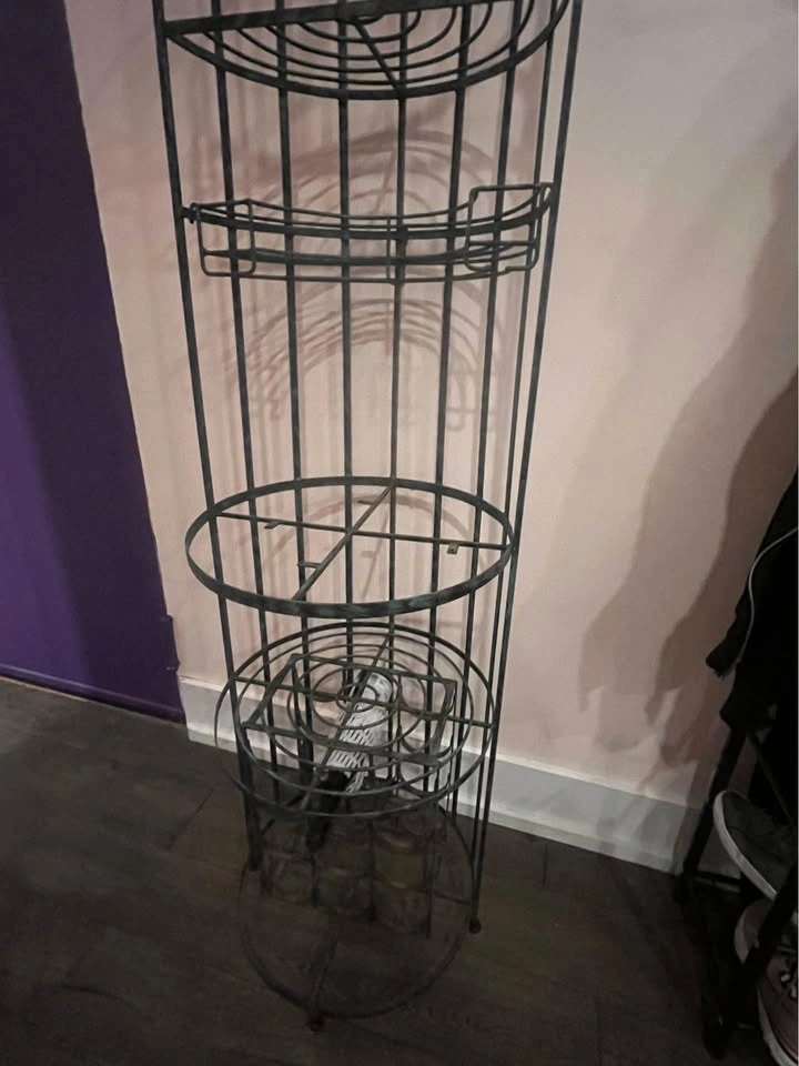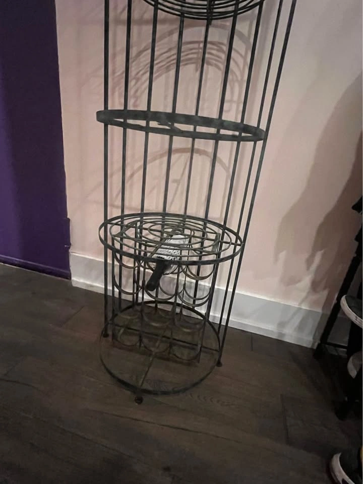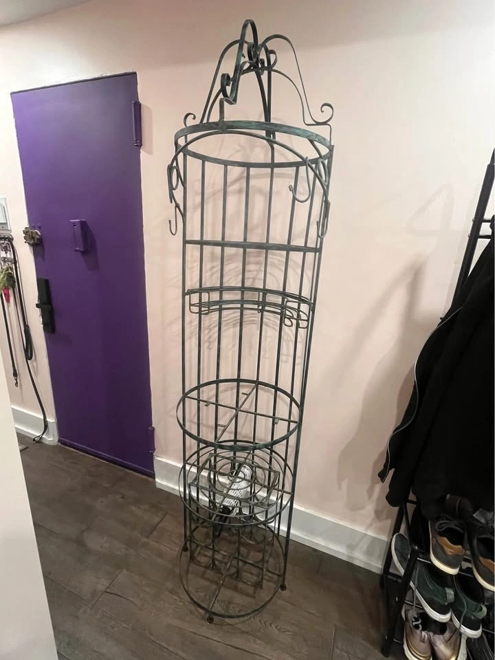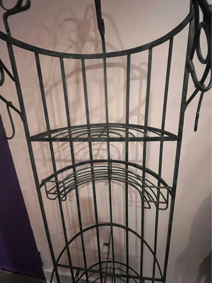 Fabulous wine rack/bar table made of wrought iron. Absolutely sturdy, a.k.a. extra heavy. Lots of potential if you replace the missing table. You can use it as a coat rack, plant stand, or bar table. It's 8ft tall, so please plan on transporting it properly.
