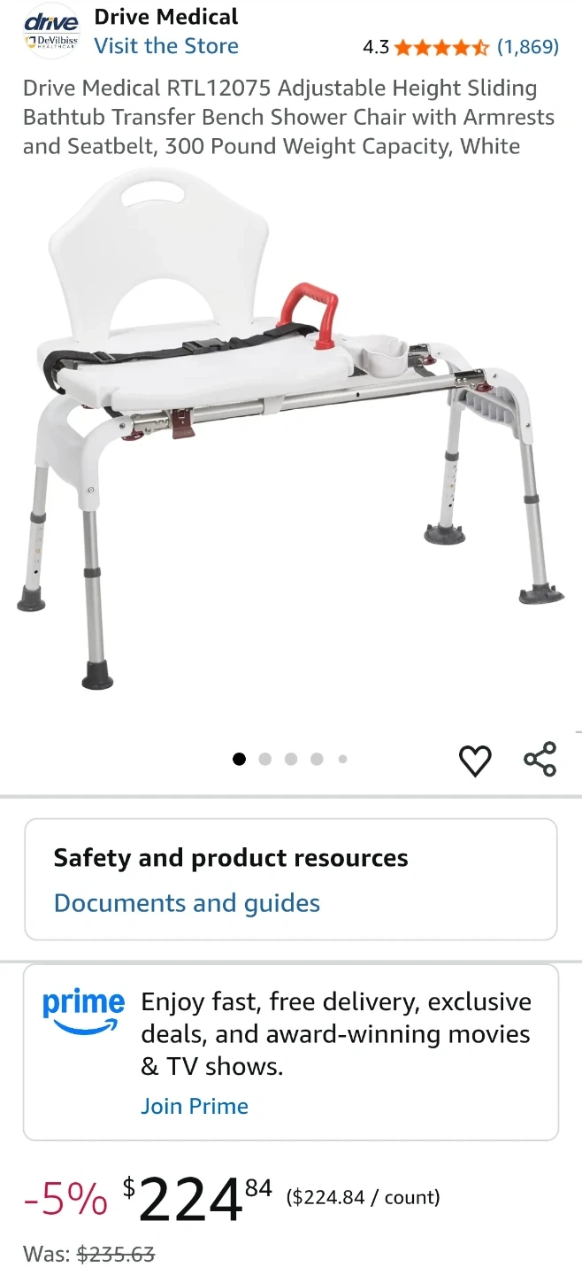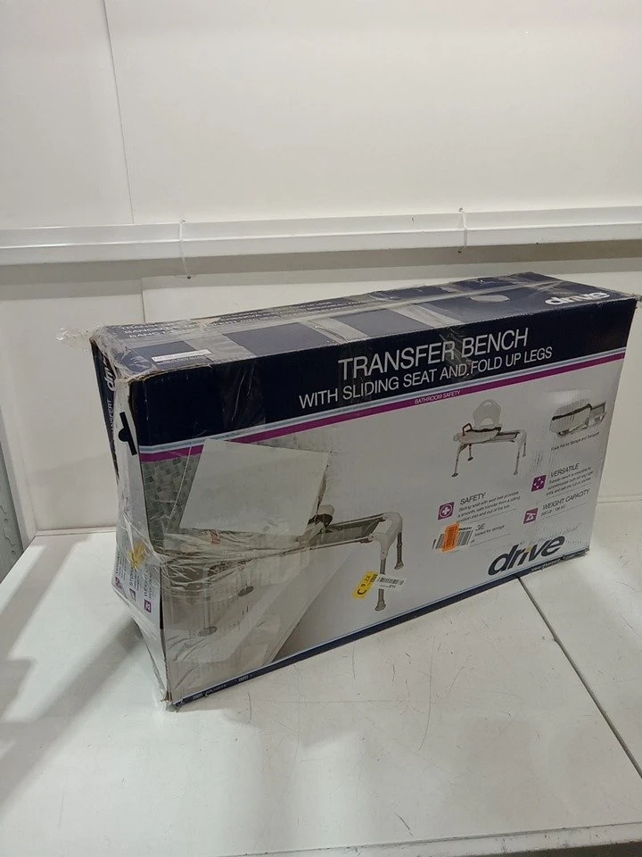 This is a Drive Medical RTL12075 adjustable height sliding transfer bench with armrests and backrest, supporting up to 350lbs. The bench is in new condition, offering secure and comfortable assistance for anyone needing help getting in and out of the tub or shower.