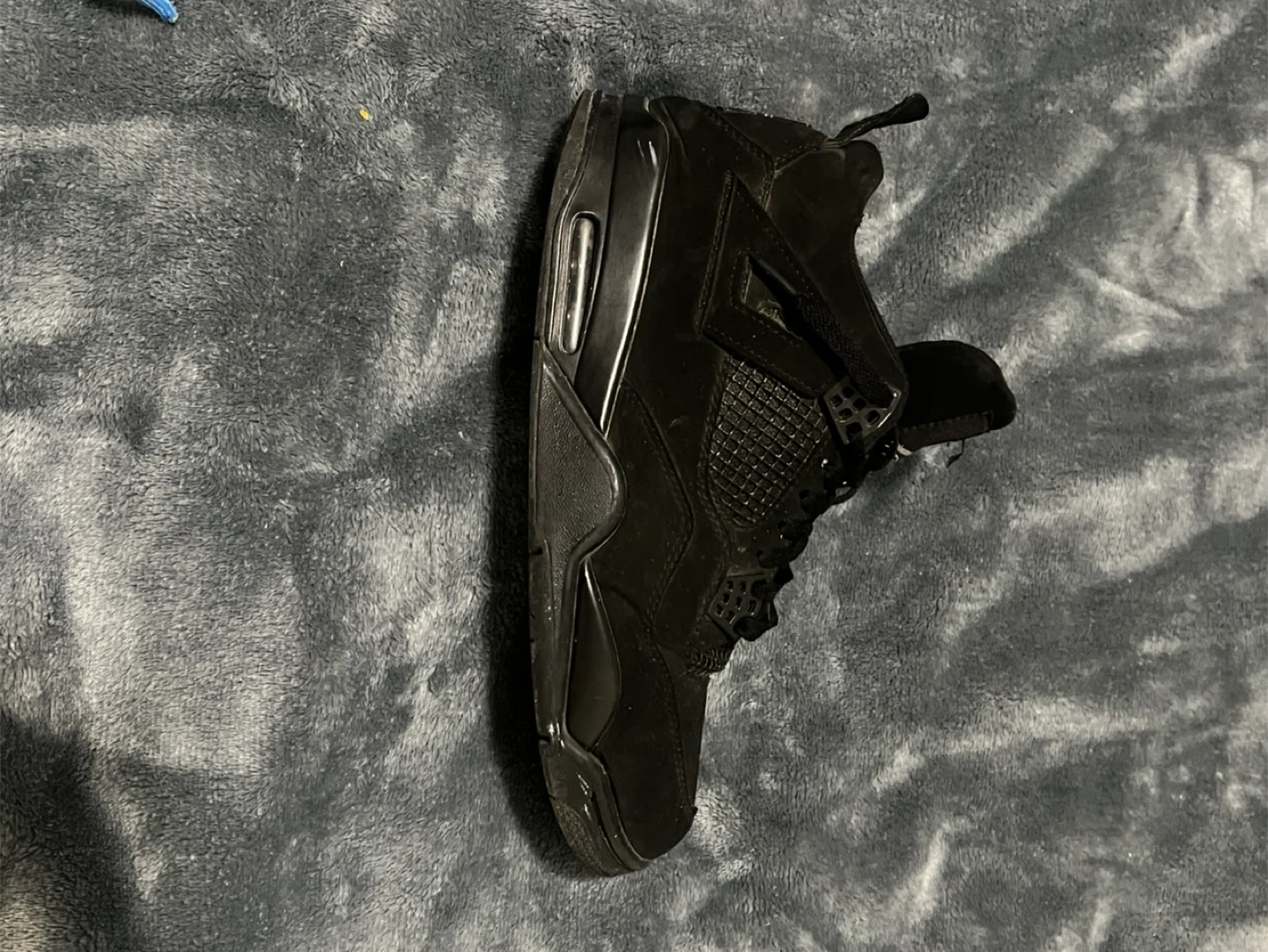 A pair of Air Jordan 4 Retro sneakers in a black colourway. These shoes are made with a mix of leather and textile materials. They feature the iconic Jordan 4 silhouette and detailing. These would be great for sneaker enthusiasts and casual wearers alike!