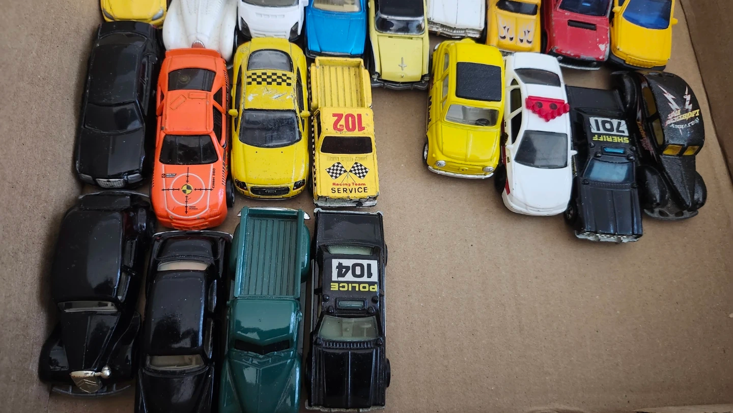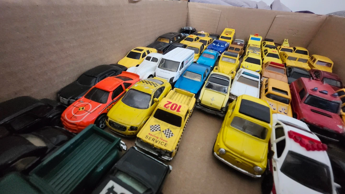 A collection of various die-cast toy cars, including taxis, police vehicles, and other models. They come in different colours and designs.